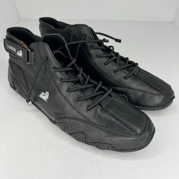 Elevate your casual shoe game with these sleek black Mid-tops from LDeck. Featuring a clever HooknLoop closure and almond toe shape, these shoes are perfect for any occasion from a day out with friends to a casual work environment. The synthetic lining and insole provide comfort while the solid black outsole adds a touch of sophistication. Available in UK size 8.5 and US size 9, these shoes are a must-have addition to any stylish man´s wardrobe. The solid pattern and black color make them versatile enough to match with any outfit. Get ready to step out in style with these LDeck men´s shoes.100% CUSTOMER SATISFACTION IS OUR GOAL!Our items are always carefully examined for condition, measured if necessary, and photographed in a climate controlled and smoke-free environment. We make every attempt to accurately describe and clearly picture the items we have for sale. Please, ALWAYS view all of the photos. We value your business and our goal is your complete satisfaction.FAST SHIPPINGAll items are packaged with care and shipped out the same or next business day via USPS, FEDEX, or UPS with tracking numbers so you are always informed.