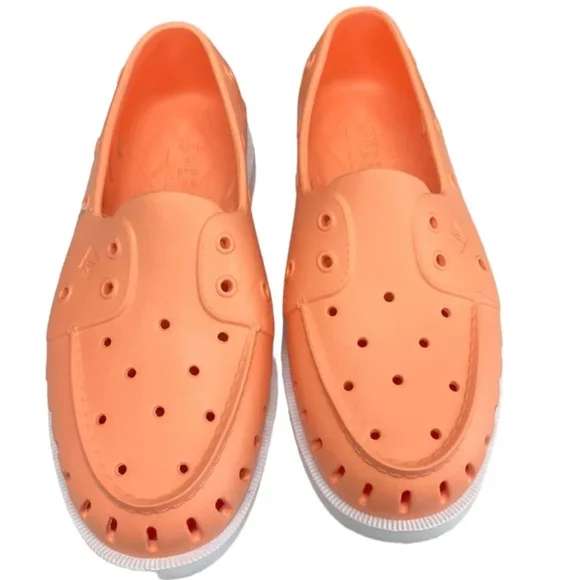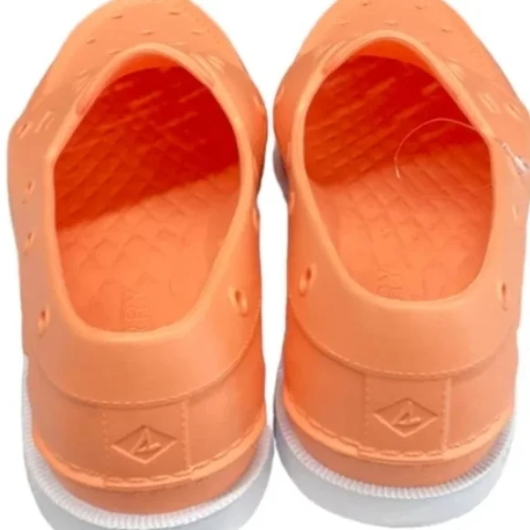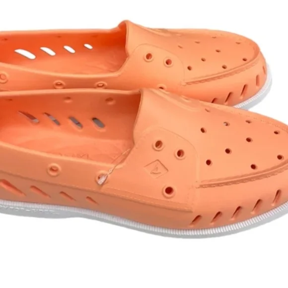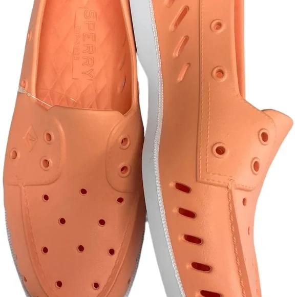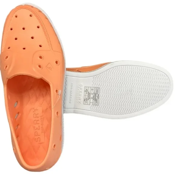 Stylish Sperry slip-on shoes. Vibrant orange/peach color. Comfortable and breathable design.NewColor:PeachSize:Men´s 12Style: Original FloatWater-resistant, lightweight injected EVA upper; drainage holes along waterline and topsideMolded Wave-Siping outsoleApproximately 2"H soleFit: true to sizeBlown EVA constructionThe ultimate get-wet Sperry boat shoes maintain the shape of the original but feature an ingenious system of “portholes” and “gills” that drain water to keep feet fresh. Its non-marking rubber outsole and classic profile make it a match for land as well as sea.Breathable ‘portholes” on top-side keep feet freshStrategically placed “gills” that drain waterNon-marking outsoleOutsole with Signature Sperry Molded Wave-Siping™ for enhanced traction