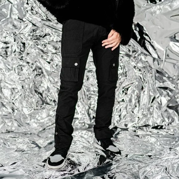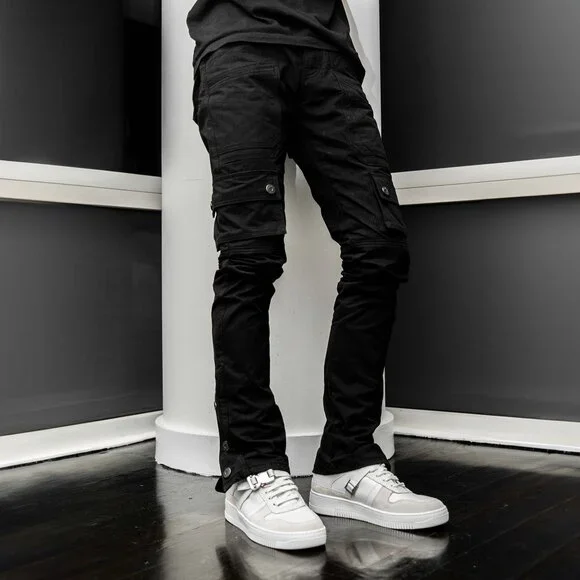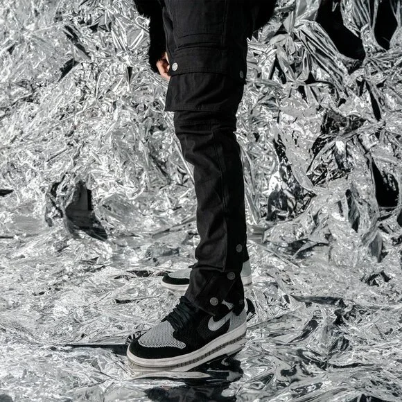 With tactility and comfort being our main focus on this piece, the Canvas Cargo Snap Pants are equipped with eleven fully functional discrete pockets. Crafted with premium canvas, the piece is lightweight and durable for easy movements. These straight legged pants are designed to be a slimmer fit to the classic baggy cargo pants. The snap buttons at the leg opening allows for a natural and modern flared look to sit over sneakers and boots perfectly.Model is 6´1 , 190 lbs wearing size 36 in the canvas snap cargos with Nike AJ 1s.Straight leg cargo pantsCrafted with premium canvasLightweight and durableTactical inspired multi pocket detailsEleven discrete pockets throughoutAK branded gunmetal snaps