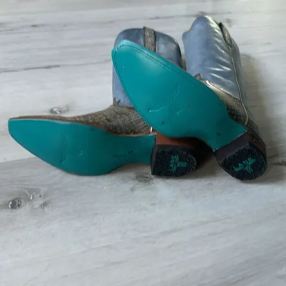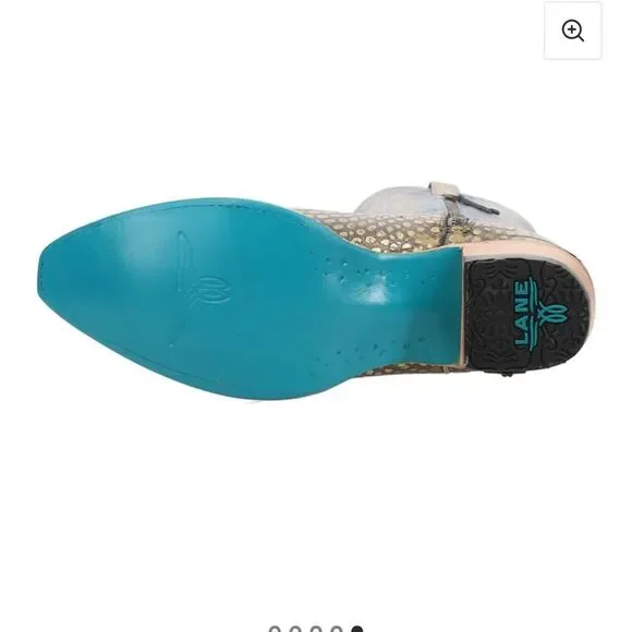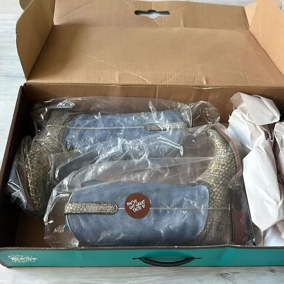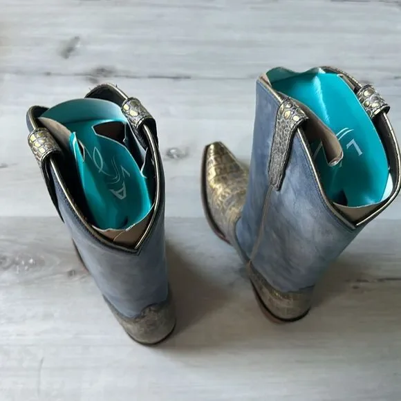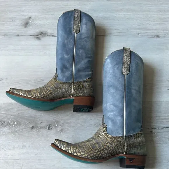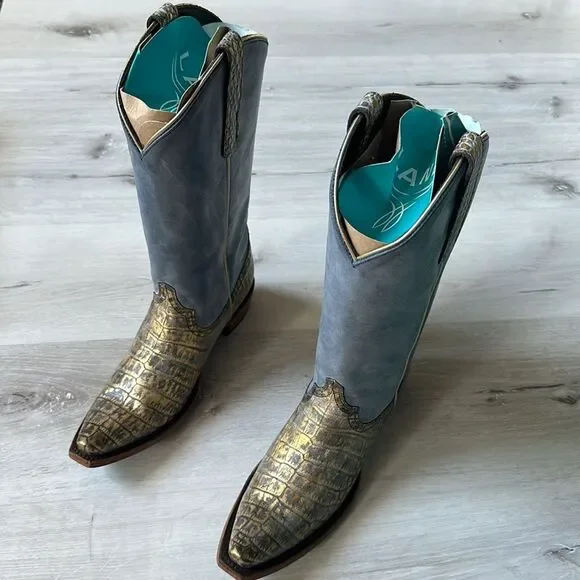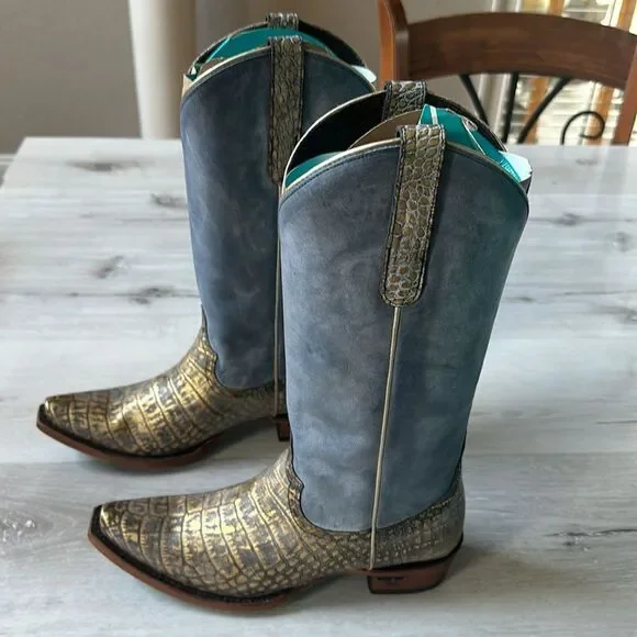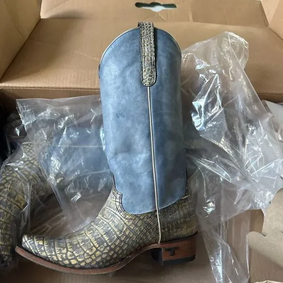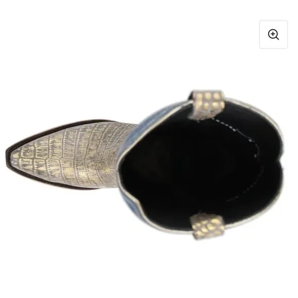 LANE Skylight Metallic Embossed Croc Caiman Snip Toe Cowboy Boots Blue 7.5 Nwt