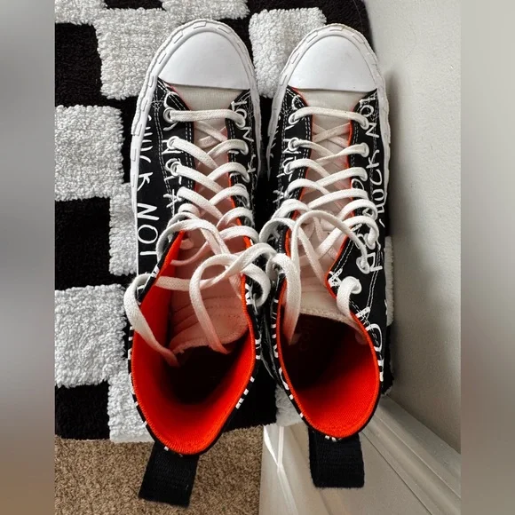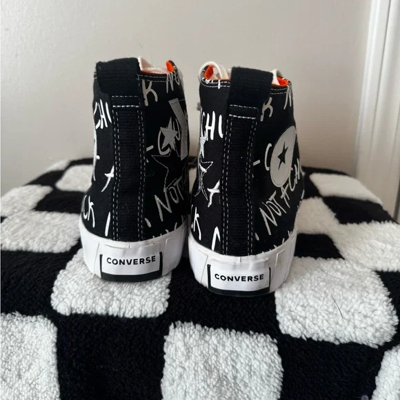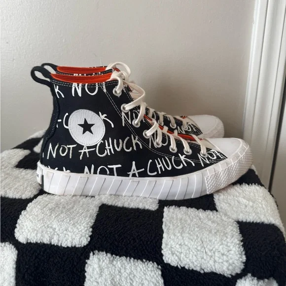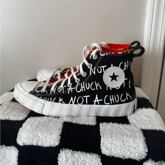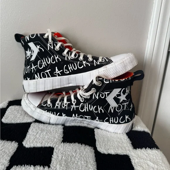 Stand out from the crowd with these unique Converse "Not a Chuck" high tops, a fresh and edgy take on the classic Chuck Taylor All Star.These sneakers feature bold "Not a Chuck" graphics throughout, balanced by a solid polyester tongue and eye-catching color pops on the lining and outsole.The iconic star patch is reimagined in synthetic leather on the outer ankle, while Star Chevron detailing and embroidery grace the inner side.Deconstructed and overlapped elements complete the look, creating a truly original style.Details:Size: Men´s US 9Style: High Top SneakersMaterial: Durable Canvas with Polyester TongueColor: Black and White with Red/Orange Accents (See Photos)Condition: Excellent pre-owned condition.Features:SMARTfoam insole for cushioningVulcanized midsole and toe bumperAllover "Not a Chuck" graphicsDie cut synthetic leather ankle patchesSmoke-free home. Fast shipping!Why You Should Be Down:Canvas high top sneakers with polyester tongueSMARTfoam insole for cushioningVulcanized midsole and toe bumperAllover "Not a Chuck" graphicsDie cut synthetic leather ankle patchesHashtags:#Converse #NotAChuck #HighTops #MensShoes #Size9 #Sneakers #Streetwear #UniqueSneakers #ConverseHighTops #Preowned #FastShipping #CanvasSneakers #StarChevronDisclaimer:Please view all photos as they are part of the description.I have captured the details of these sneakers, including their unique design elements and overall condition, as accurately as possible.