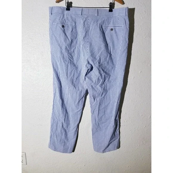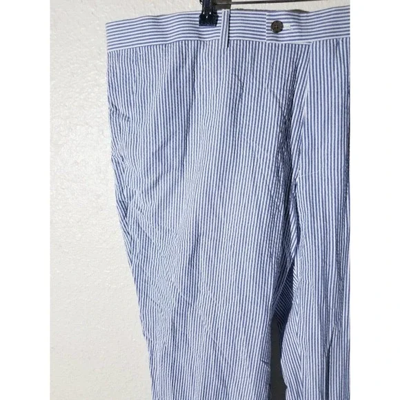 Style : flat front pantsSize:42 waist x 30"Approximate measurements laying flat:Waist - 42" (+2 inches extra fabric to let out)Front rise -13.5"Inseam - 30" (+1.5" extra fabric to let out)Leg opening width - 9"Material tag: cotton seersuckerCondition :New without tags. Smoke-free and pet-free environment