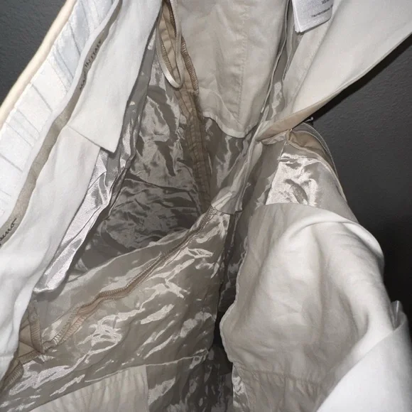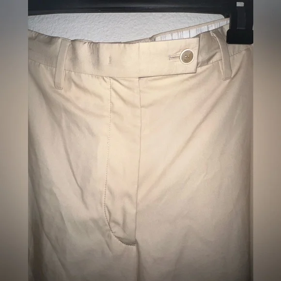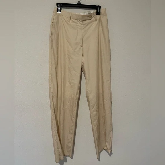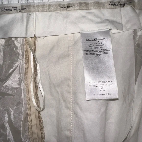 Size 42 = XX Small MeasurementsWaist : 39 cm flat (78 total)Length: 44.75 inches or 114 cm Made in ItalyWide trousers made of technical cotton fabric. An asymmetric tab closure at the waist couples with slit pockets at the hips and a welt pocket at the back. The leg stays soft, with stretch fold before and behind. Comfort fitMade with 70% Cotton and have a unique nylon reflective look to them These are brand new without tagsThey are currently selling at Nordstroms and online at Ferragamo at $1190Last photo shows the cream lining underneath main material-> very nice feature of these