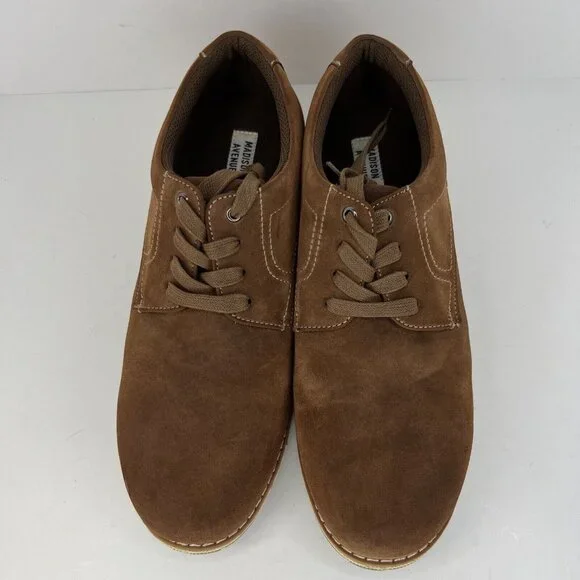 Elevate your shoe game with these stylish Madison Avenue Casual Oxford Shoes. The round-toe, lace-up design features a beautiful golden brown color that complements any outfit for everyday wear or dressy occasions. These shoes are perfect for men´s size 7 and made with manmade suede-look textile upper material and fabric lining material for ultimate comfort.The shoes also come with standard shoe width and a rubber outsole material that provides moderate cushioning level for a comfortable and secure walking experience. The solid pattern shoes come with show laces and are perfect for fall and spring seasons. The shoes are branded Madison AVE and are part of the Madison Avenue product line, making them a must-have for any shoe collection.100% CUSTOMER SATISFACTION IS OUR GOAL!Our items are always carefully examined for condition, measured if necessary, and photographed in a climate controlled and smoke-free environment. We make every attempt to accurately describe and clearly picture the items we have for sale. Please, ALWAYS view all of the photos. We value your business and our goal is your complete satisfaction.FAST SHIPPINGAll items are packaged with care and shipped out the same or next business day via USPS, FEDEX, or UPS with tracking numbers so you are always informed.