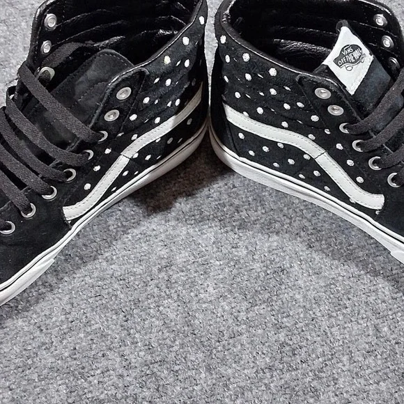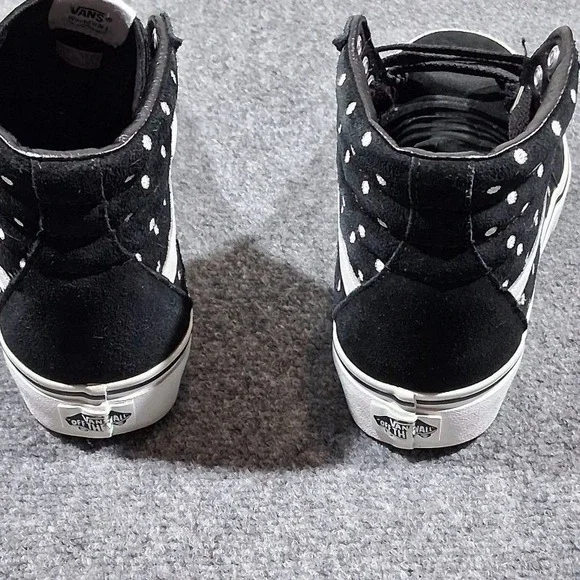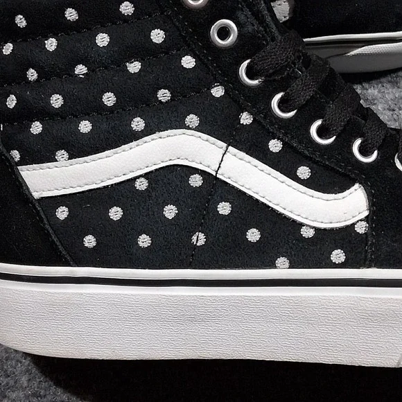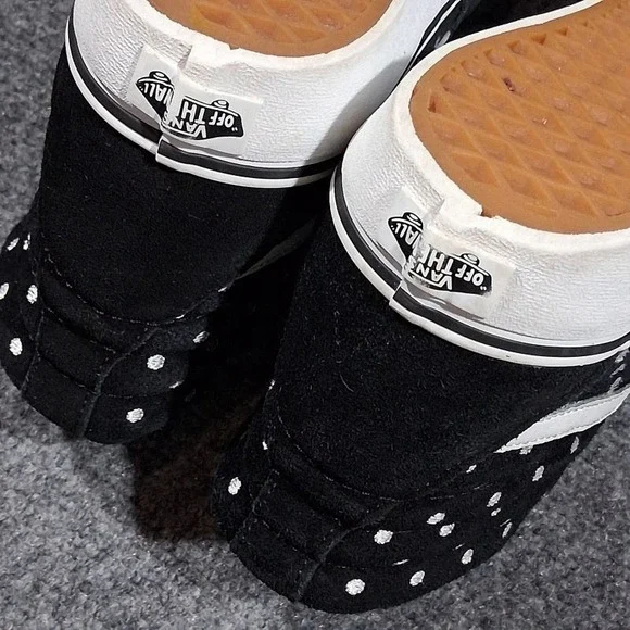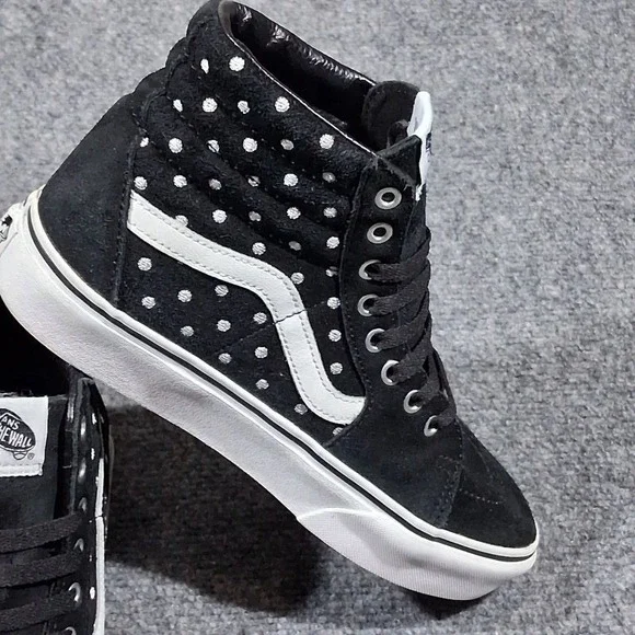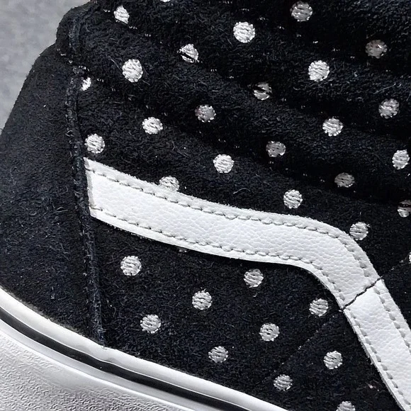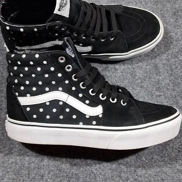 Step up your skate game with the Vans Unisex Platform Skateboard Sneakers. Crafted for both style and function, these high-top trainers feature a sleek black suede upper adorned with a spotted pattern that adds a splash of classic flair to your footwear collection. Designed to accommodate a range of activities from skateboarding to casual walks, the shoes boast a comfortable foam insole and a durable rubber outsole for superior grip on any surface. Breathable canvas lining ensures your feet stay cool and comfy, while the lace-up closure provides a secure fit. Whether you´re hitting the skate park or just chilling out, these Vans Sk8-Hi shoes are a versatile addition to your wardrobe, offering the perfect blend of fashion and performance for every season.