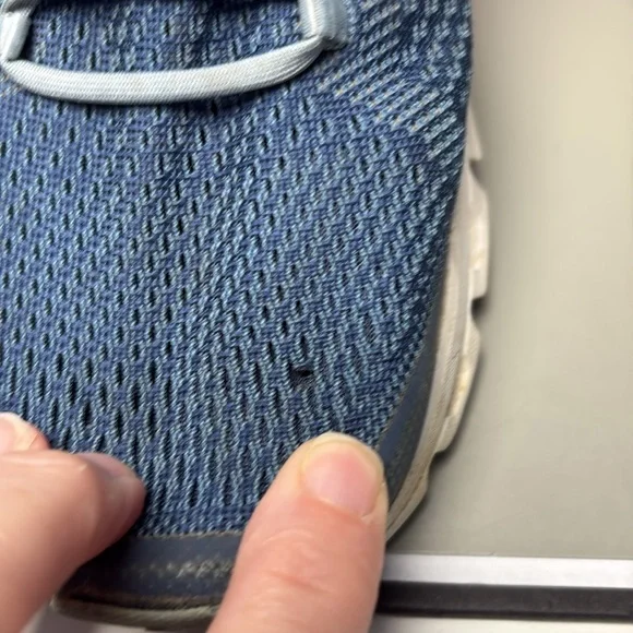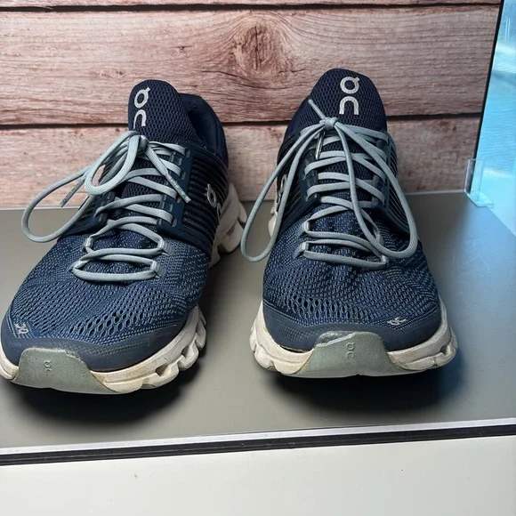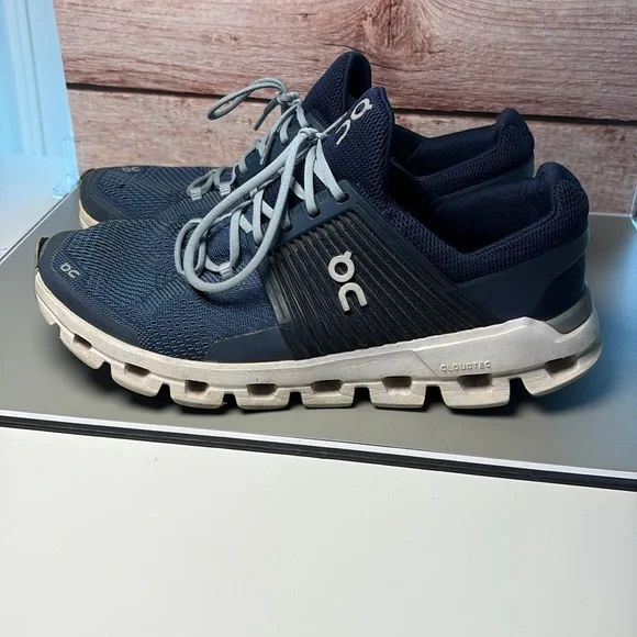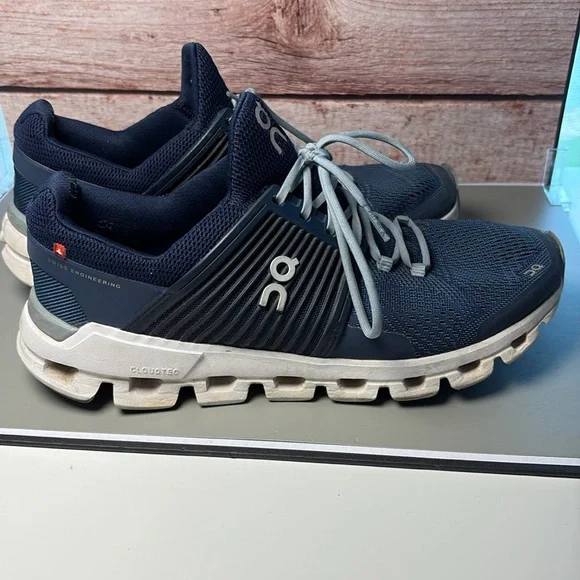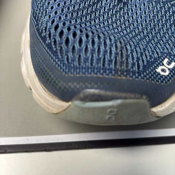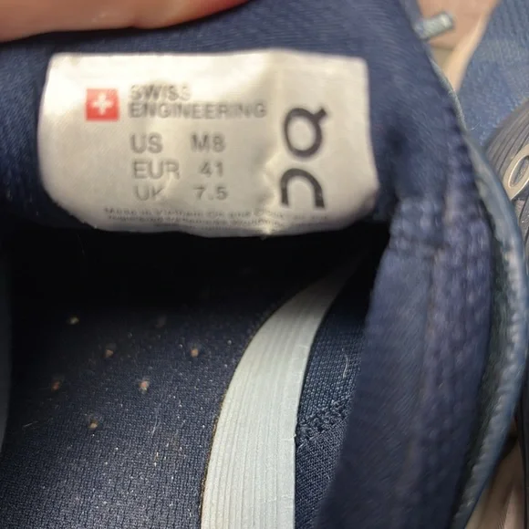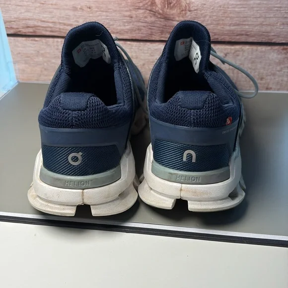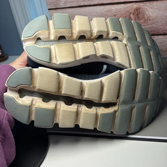 Sleek navy design with white accents. Ideal for running and casual wear. Lightweight and breathable. Pre owned but have a lot of life left in them.