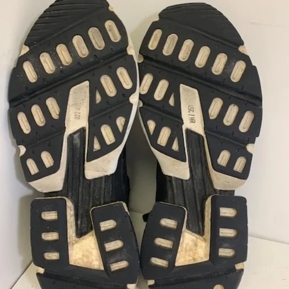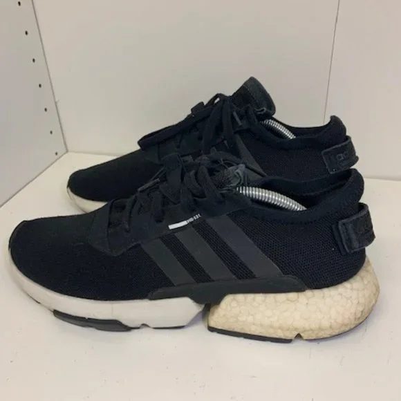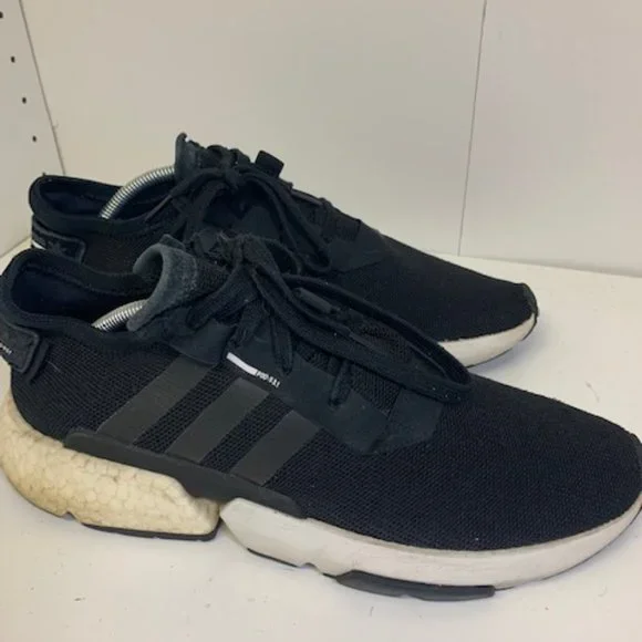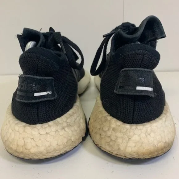 Preowned - Good condition. Uppers looks great - soles are also in great shape. Some visible wear on the heals and a crack in the right heal (see pics). Adidas POD S3.1 Sneakers. Men´s size 11.5. Color: Black with white accent. Pricing reflects discount for the discoloration/crack on the heal. (INVUD784-2)