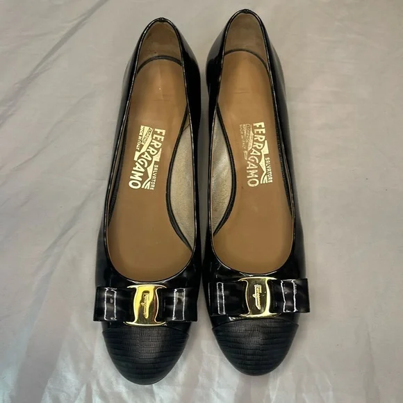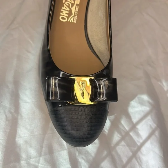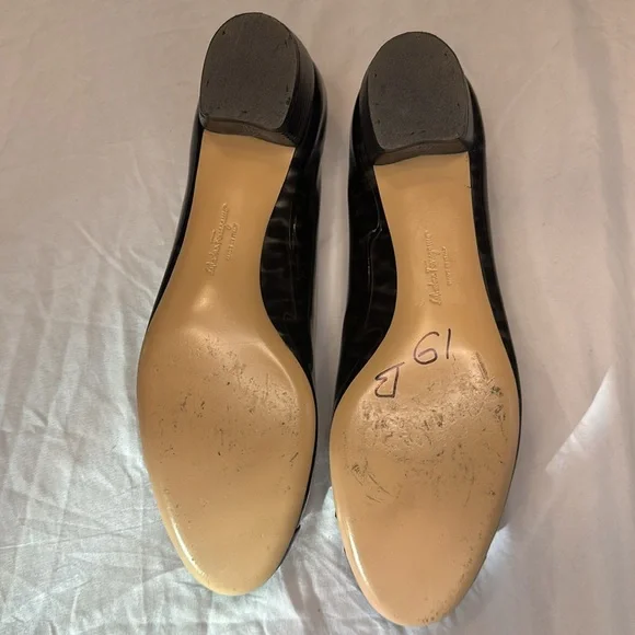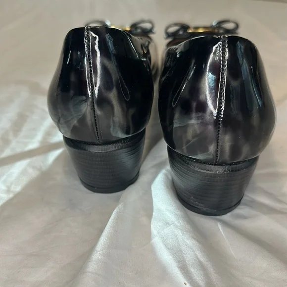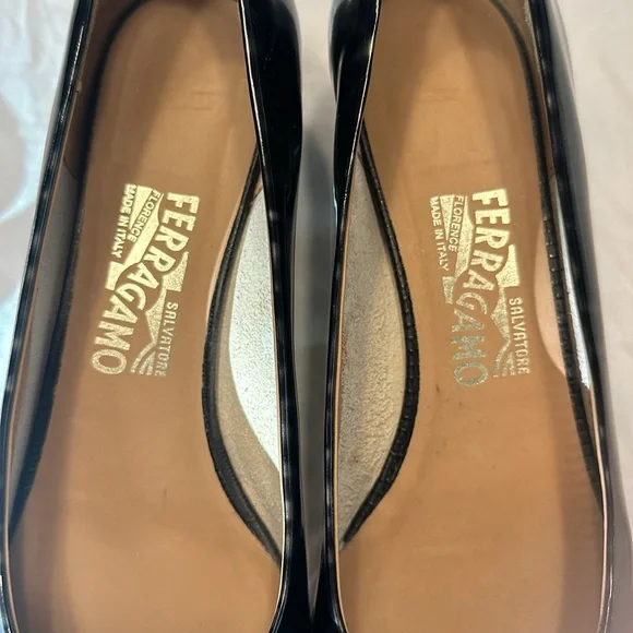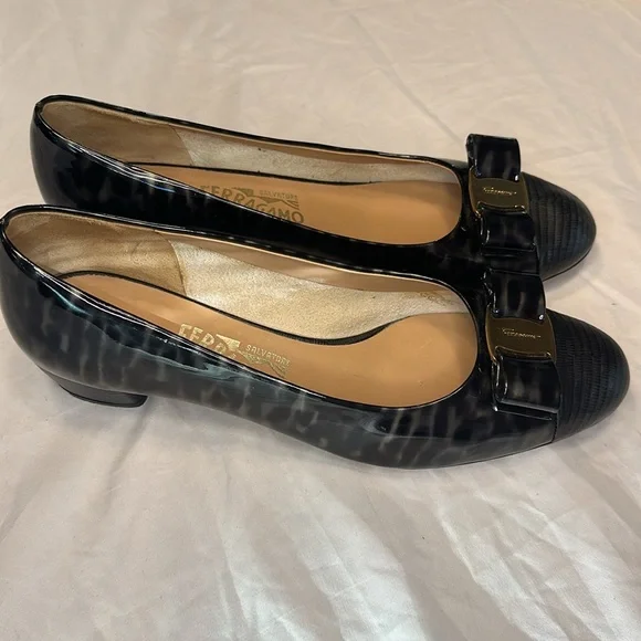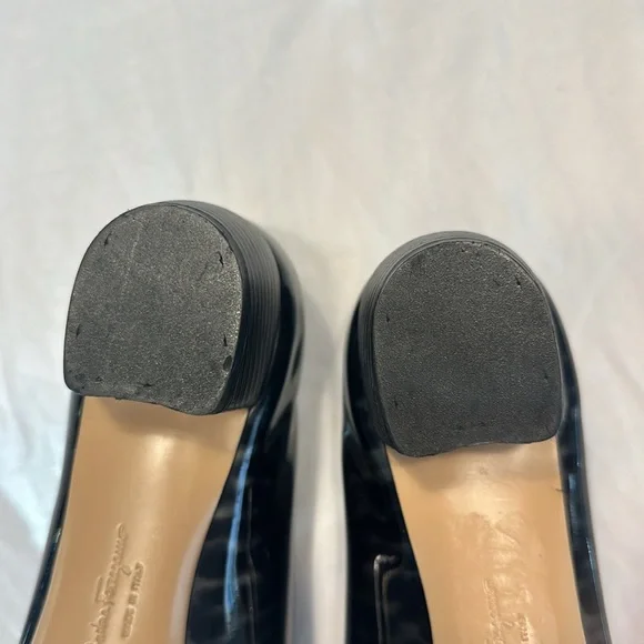 Salvatore Ferragamo Vara Patent Charcoal & Black heels EUC size 9 B