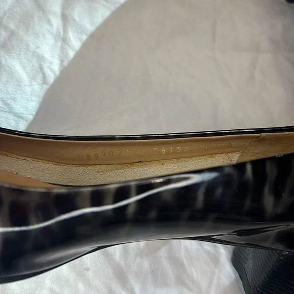 Charcoal and black patent leather calf skin size 9 pumps. Gold accent bow. Worn once for photo shoot.