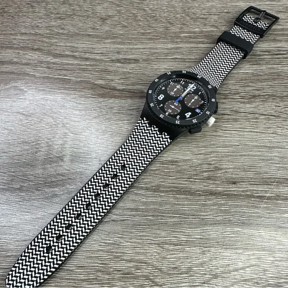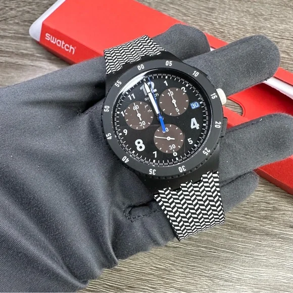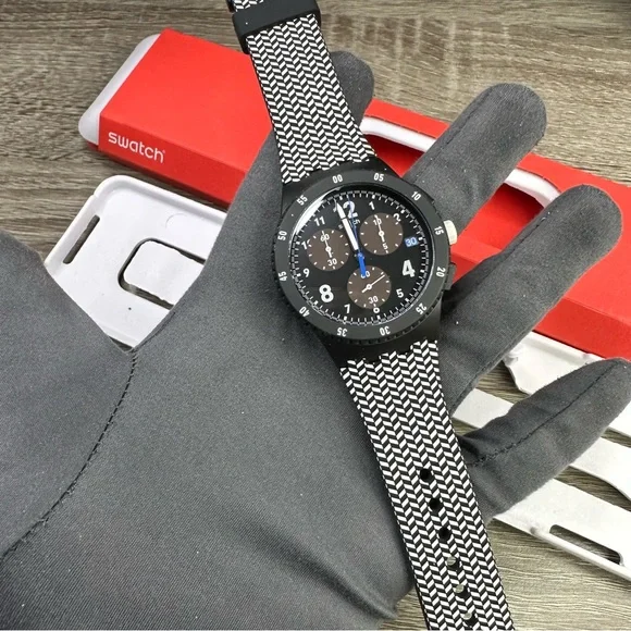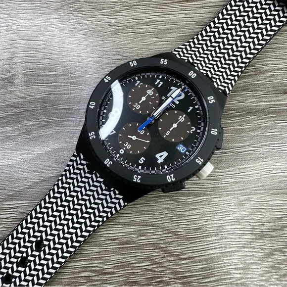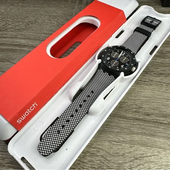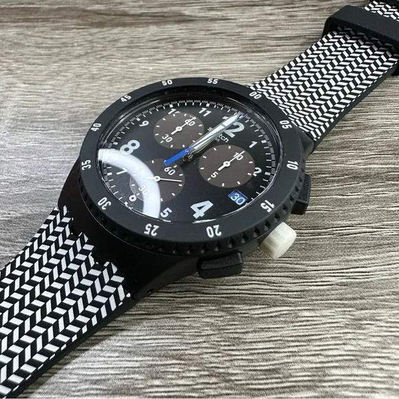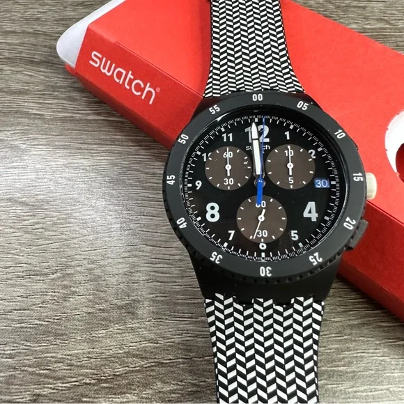 Swatch is a brand of affordable and fashionable wristwatches that gained popularity in the 1980s. These watches are known for their vibrant colors, innovative designs, and playful aesthetics. Swatch watches often incorporate plastic cases and bands and are recognized for their Swiss quality and unique approach to timekeeping.✅This watch was purchased at the swatch store in Manhattan, New York✅Perfect for watch lovers or collectors!✅MOVEMENT TECHNOLOGY Quartz✅CASE DIAMETER 42mm✅CASE MATERIAL Black Plastic✅DIAL Black And White With Chronograph✅BAND TYPE Silicone✅BAND COLOR Black And White✅BAND Width 20mm✅CRYSTAL Scratch Resistant Acrylic Crystal✅CLASP Buckle✅WATER RESISTANCE 30m / 3Bar / 100ft✅If you have any questions leave me a message below!