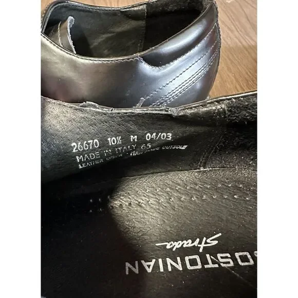 Bostonian Strada Dress Shoes Men´s Size 10.5 Black Leather Lace Up Made In ItalyWorn a couple times. Come as pictured. Thank you for the interest in the item listed. I take detailed pictures to paint the best picture possible. Please don´t hesitate to ask for more details or more specific pictures. All of my items are generally odor free...non smoking and free from mildew. Item color may vary due to photo lighting or screen resolution. I accept returns on items and will refund buyer on cost of item as long as the item is returned in the same condition as it was originally shipped as in sealed packages or tags on new items. Do not unseal or remove tags if new or wash if new then try to return new items.
