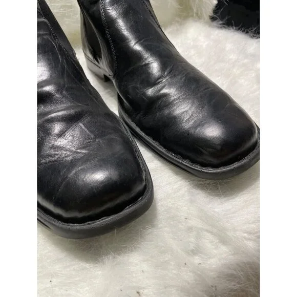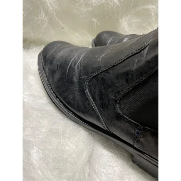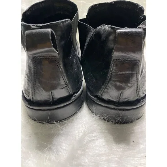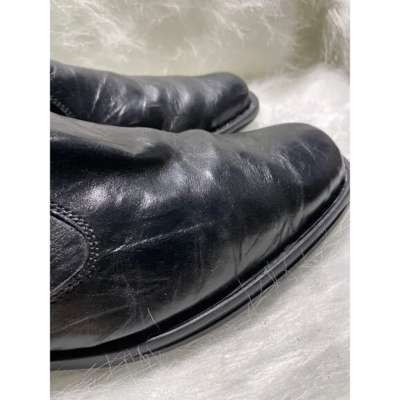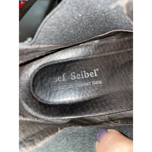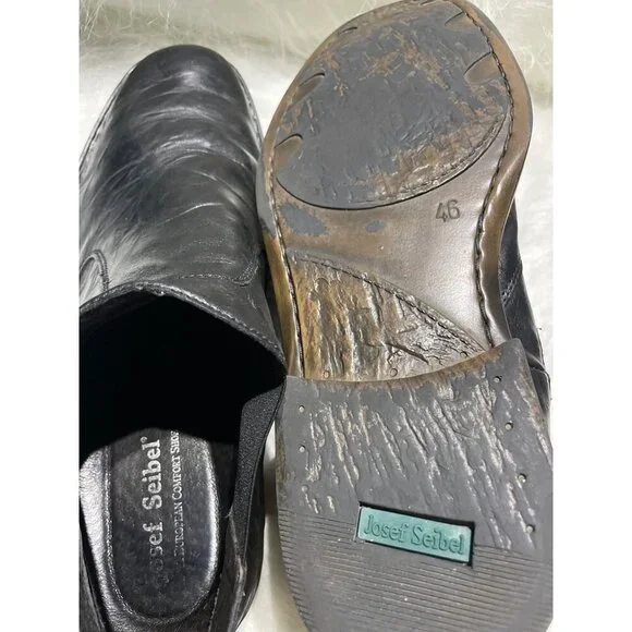 These Josef Seibel shoes offer a blend of style and comfort with their European craftsmanship. The leather material provides durability and a sleek appearance.• Slip-on design for easy wear• Durable leather construction• Cushioned insole for added comfort• Classic black colorVisible scuffs and creases on leather; overall good condition.