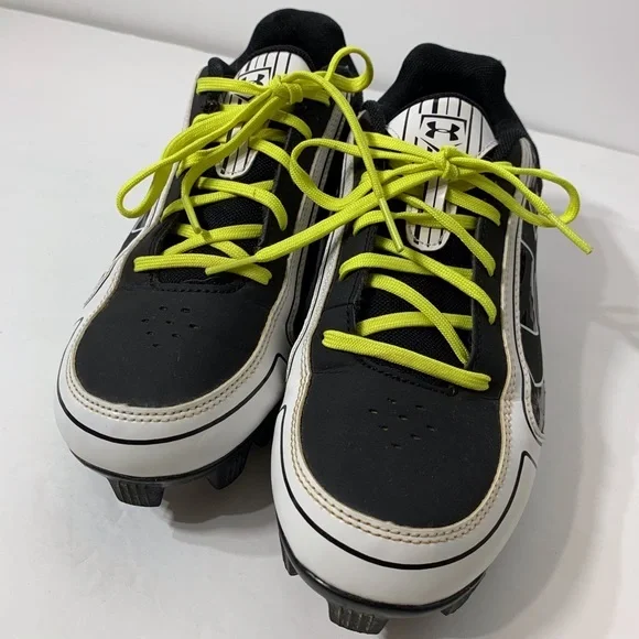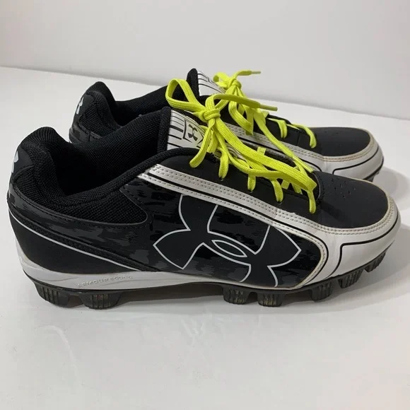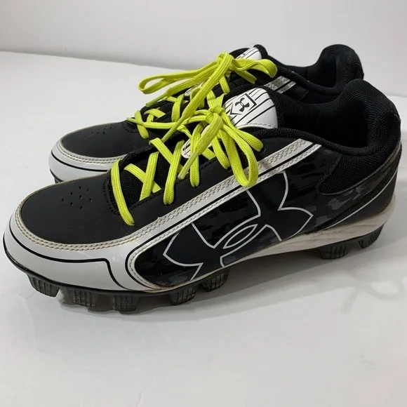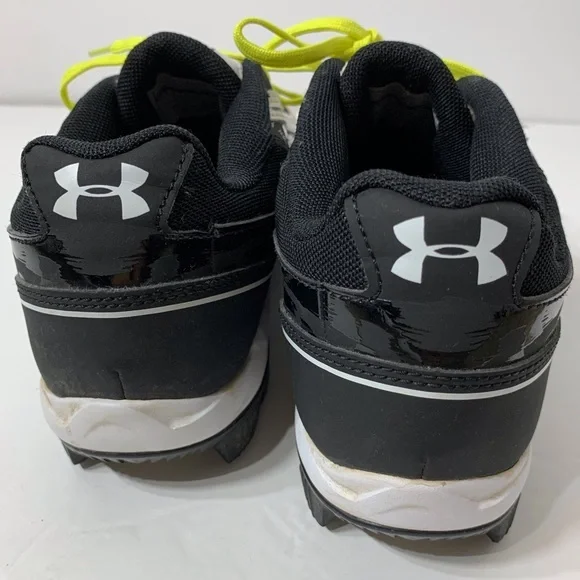 Excellent used condition Under Armour Baseball Cleats are black and white with neon yellow strings - only worn for a partial season - lot of life left in these great shoes!