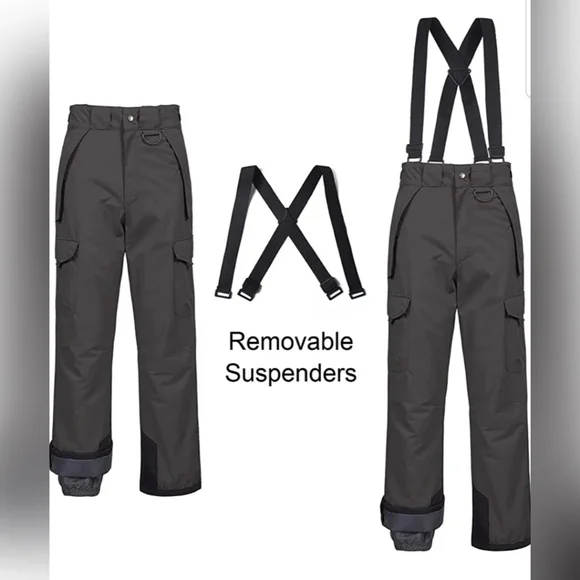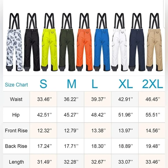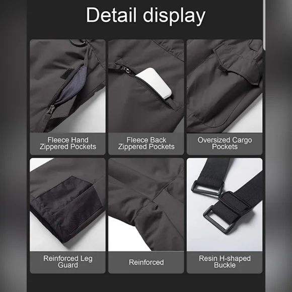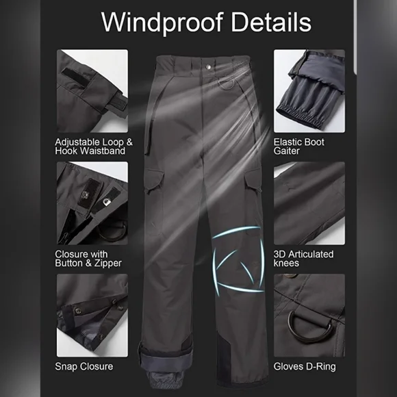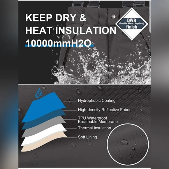 Keep Dry & Heat Insulation ---- Shell: 10000mm waterproof membrane rugged ripstop outer, hydrophobic coating, keep dry and breathable. Insulation: Soft and fluffy down alternative padding, effective heat insulation. Lining: Silky polyester anti-static fabric, move freely during skiing.Reinforced & Long-lasting Ripstop ---- Zipper & metal snap button with Inner loop & hook in front. Reinforced ankle, scuff and hem guards holds up against the daily wear and tear. Reinforced leg guard .