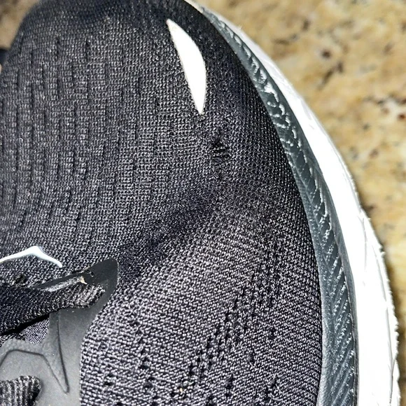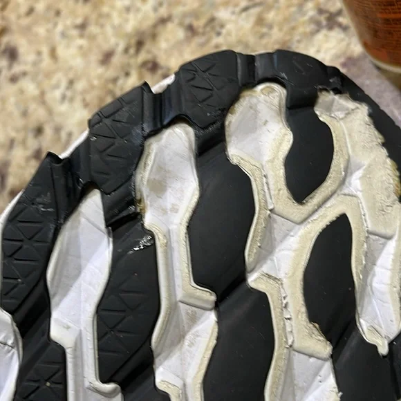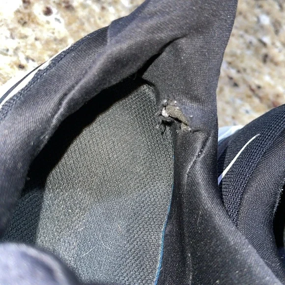 Has a rip on the back of the right ankleThe black tread on the left shoe was gluedHas a hole on the right shoe as shown in the last pictureSize 10.5 Wide Width
