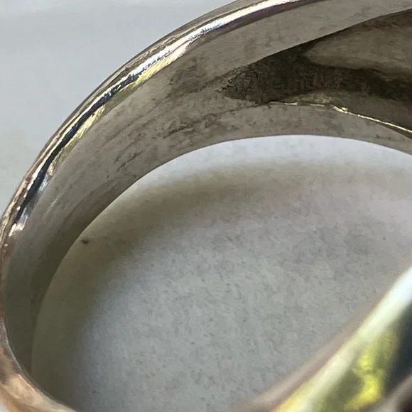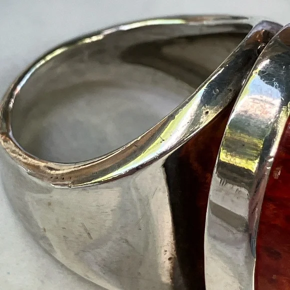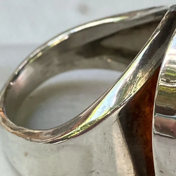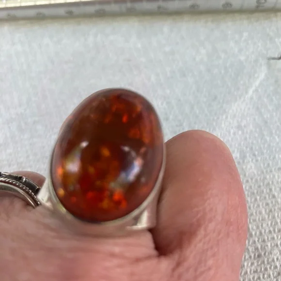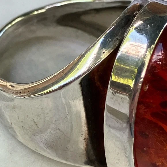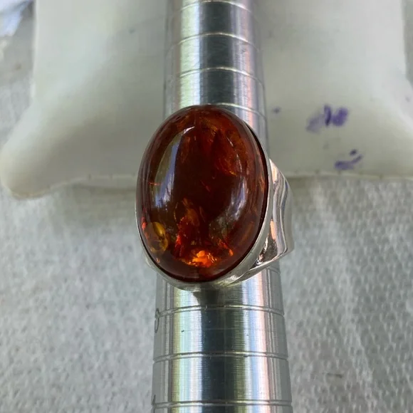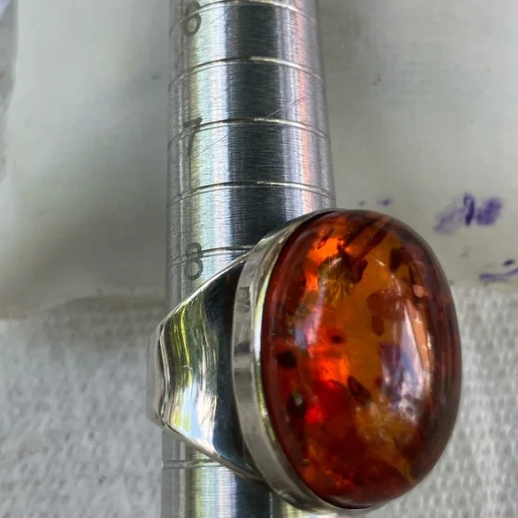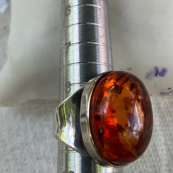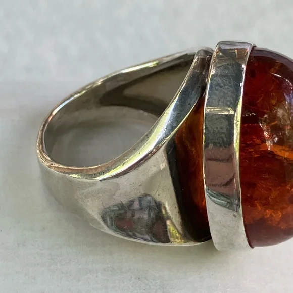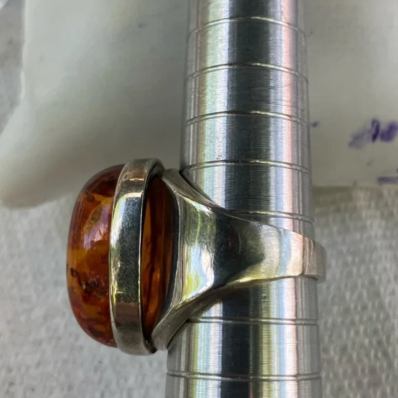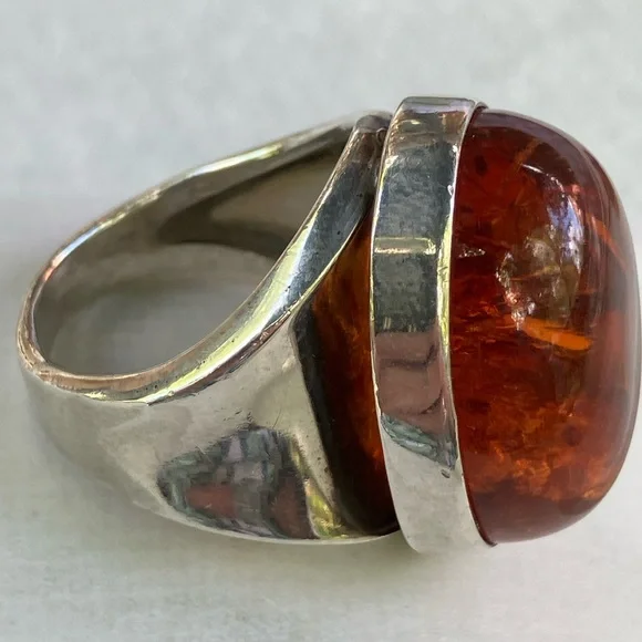 Stunning men´s ring featuring a striking amber stone set in a sleek sterling silver band. In generally good condition.Some scuffs and scratches.A gorgeous ring.About a size 9 1/2.For men or women.About 2 inches long or 21.6 mm x 16.1 mm.