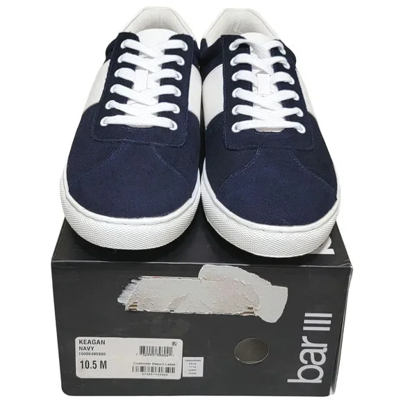 Bar III Men Keagan Low Top Lace Up Sneakers Size US 10.5M Navy Blue SuedeNew with boxTwo-tone colorblocking and a low-top profile create the cool-casual look of these cap-toe sneakers in suede and leather from Bar III.Cap toeLace-up closure with metal eyeletsLeather/suede upper; rubber soleImported