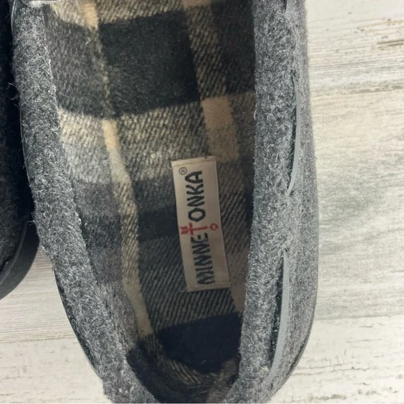 Minnetonka Men’s Rubber Bottom Slippers Size 10 Charcoal GrayFabric Upper, Blanket Lined, Rubber Outsole Great Pre Owned Condition Please Look To Photos For Any Questions