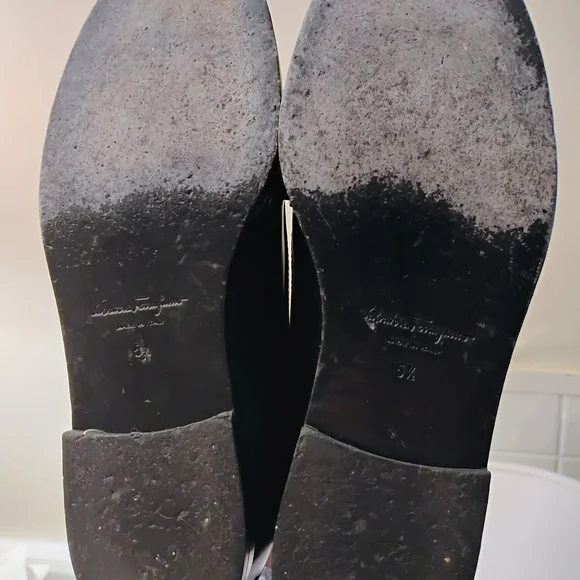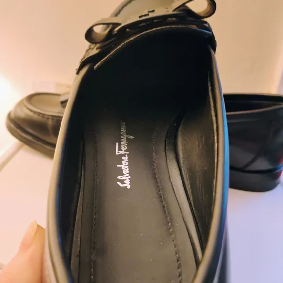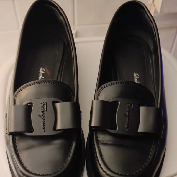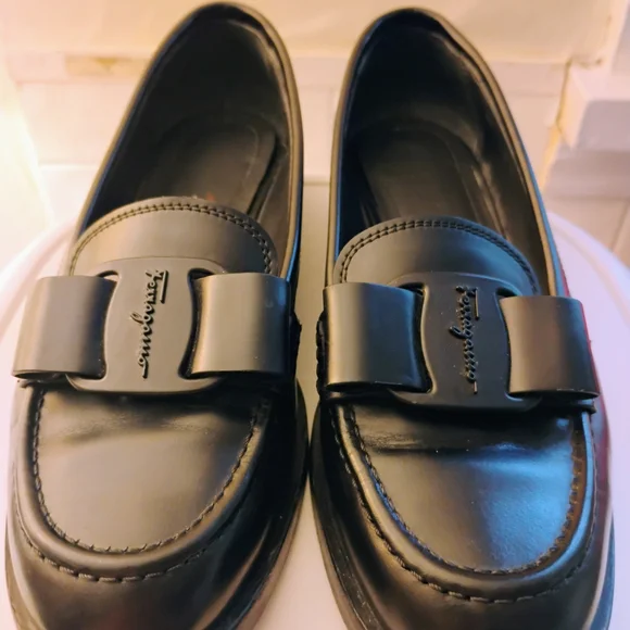 Viva bow leather loafers from.SALVATORE FERRAGAMO made in Italy; featuring black leather, signature viva bow detail, branded leather insoles, rounded toe, slip on style and low block heel. Size 5-5 1/12 Gently used with visible wear on bottom, otherwise, amazing condition.