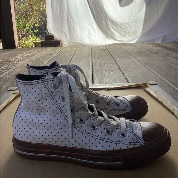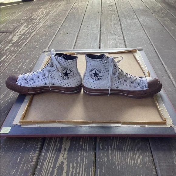 Converse white and brown high top dots converse faux wood soles Size Men’s 5Good condition Very little wear see pictures Dot Polk out details