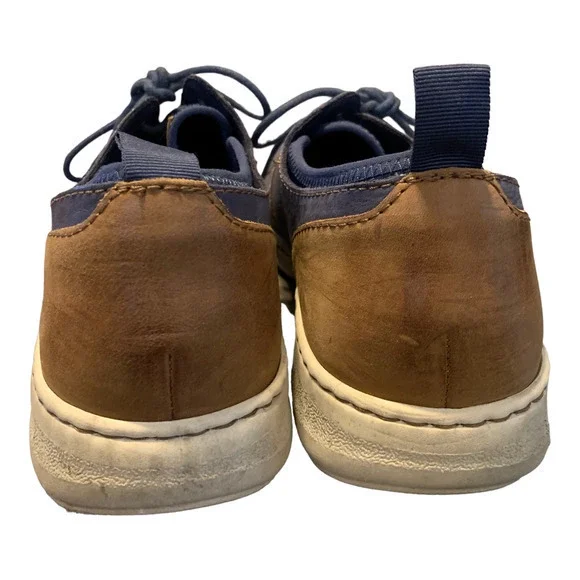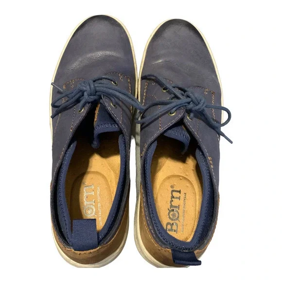 Born Marcus Mens Sneakers Sz 11.5. The perfect leather, color and style for any outfit. A clever, easygoing crossover style for busy workdays and relaxing weekends.Marcus is handcrafted with a burnished leather or wool and leather combination upper for signature character and a cozy stretch collar for added comfort.Soft hand-finished leather or combination wool and leather upperBreathable soft neoprene liningRemovable soft fabric suede covered footbed with extra foam for added comfortHigh traction flexible lightweight rubber outsoleOpanka hand crafted constructionPre-owned in great condition
