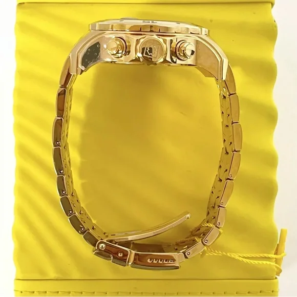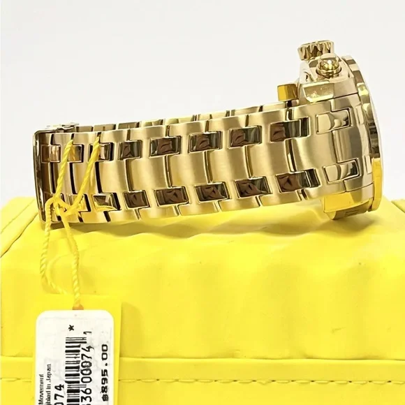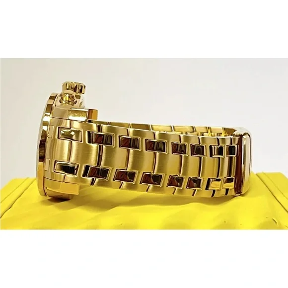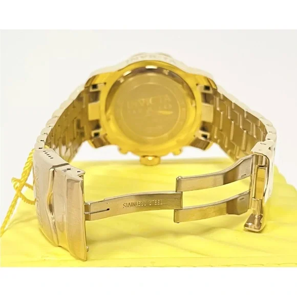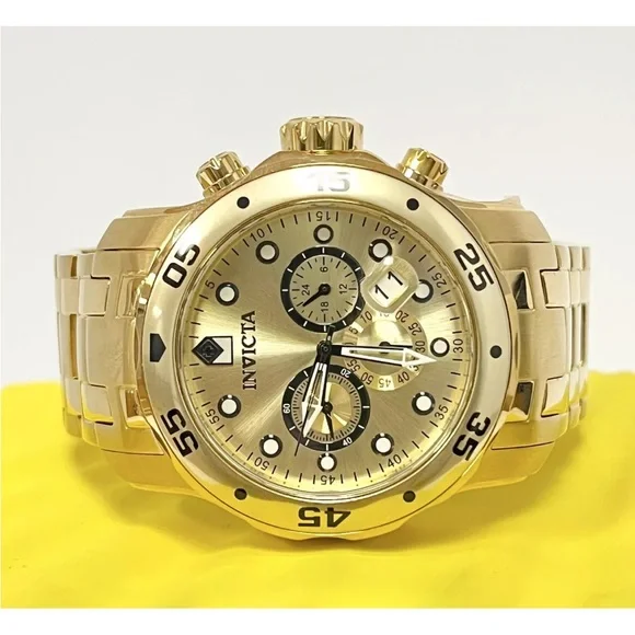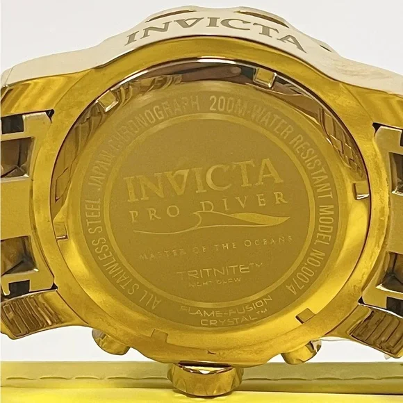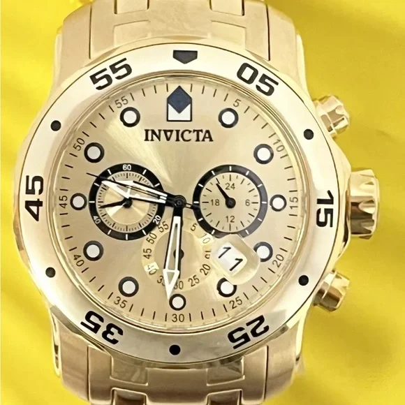 Pre Owned!!Read all below for full description!!Watch has unnoticeable tiny scratches in back of watch very unnoticeable can badly tell anything is there!!Original box and protective wipe included!Box has marks and stains !Extra photos of item can be provided when asked!This Invicta wristwatch for men, model Pro Driver, is a luxurious accessory suitable for any occasion. The round, gold-tone stainless steel case houses a gold dial with analog display, complemented by a gold bracelet. The watch features a quartz movement, water resistance up to 200 m (20 ATM), and a solid caseback.Size Appox 10 inModel 0074In addition to its stylish appearance, the watch also boasts practical features such as a date indicator and chronograph. The watch is suitable for various styles, including diver, sport, luxury, dress/formal, casual, and skeleton. With its reference number 0074, this Invicta wristwatch is a must-have for any watch enthusiast.