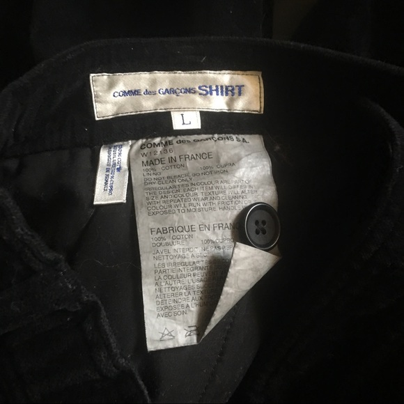 Large French velvet black dress pants. I wear a size 32 and they fit well with a belt.