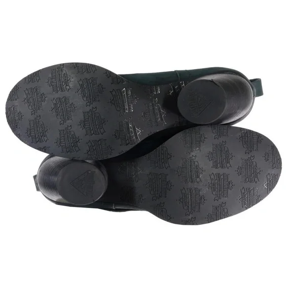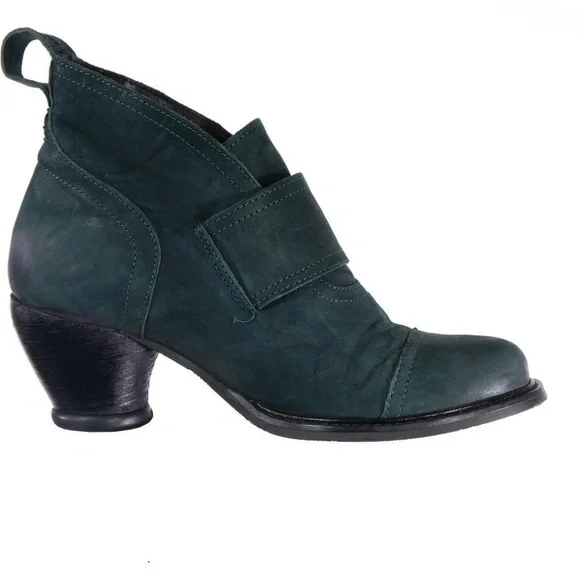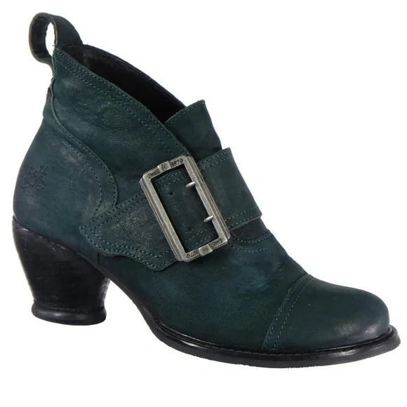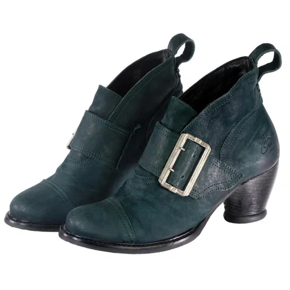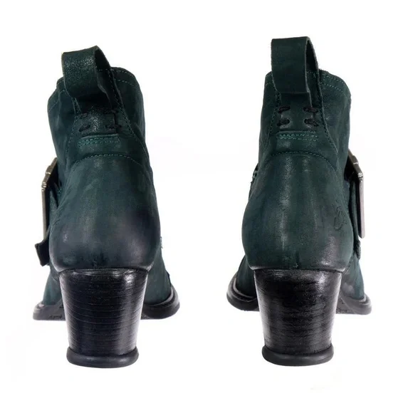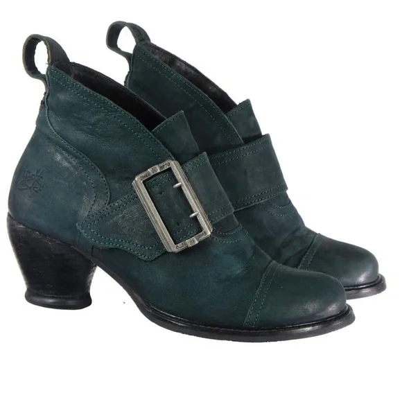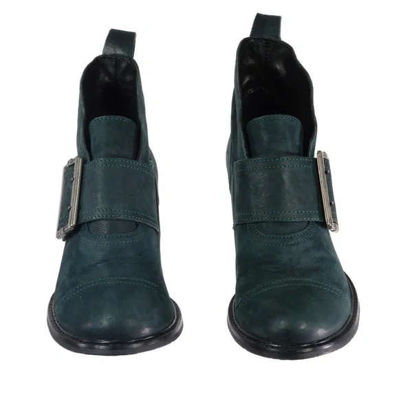 Women´s JOHN FLUEVOG ´East End Porter´ buckled ankle boots. Marked size 8. Peacock green nubuck leather uppers with decorative captoe accents. Lined with calfskin....
