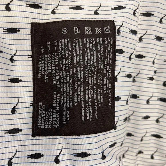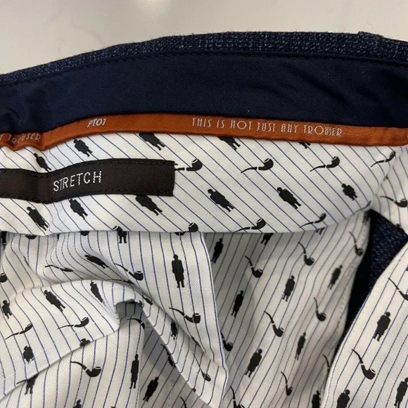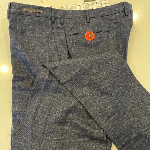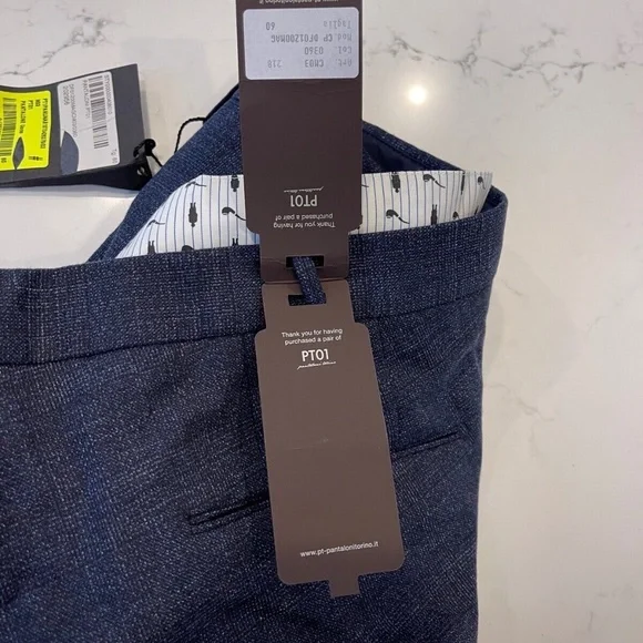 Brand new PT01 blue wool / cotton dress dress pants, size 42, unfinished . Flat front,four pockets.Slim fit.Nice blue color with some structure to the material, 1% elastane makes them stretch and comfortable to wear.Made in Italy. Originally $325