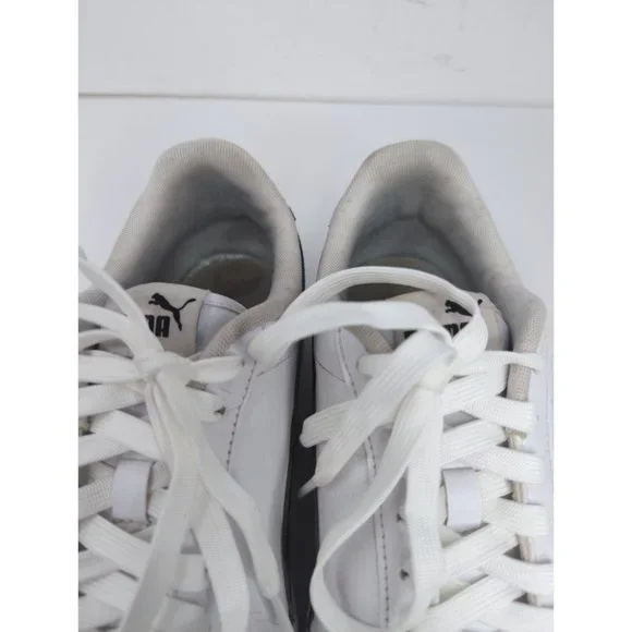 Puma Shuffle Men´s 10.5 sneakers are white and black lace-up low tops. Previously owned, they feature a round toe, flat heel, and slip-resistant rubber sole.• Puma brand•...