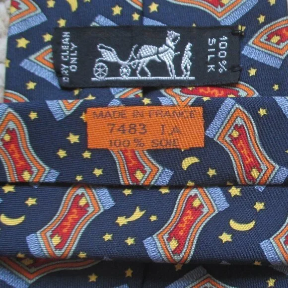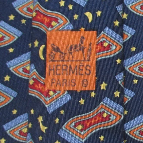 100% REAL HERMES TIE ~ NAVY BLUE w COLORFUL FUN MAGIC CARPETS ALADIN STAR MOON