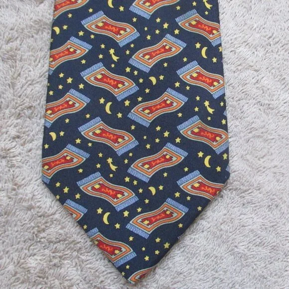 Color & Pattern:NAVY BLUE w COLORFUL MAGIC CARPETS ALADIN STAR MOONWidth: 3.45 inches at the widestLength: 59 inches longSerial number: 7483 IACondition: The tie is mint...