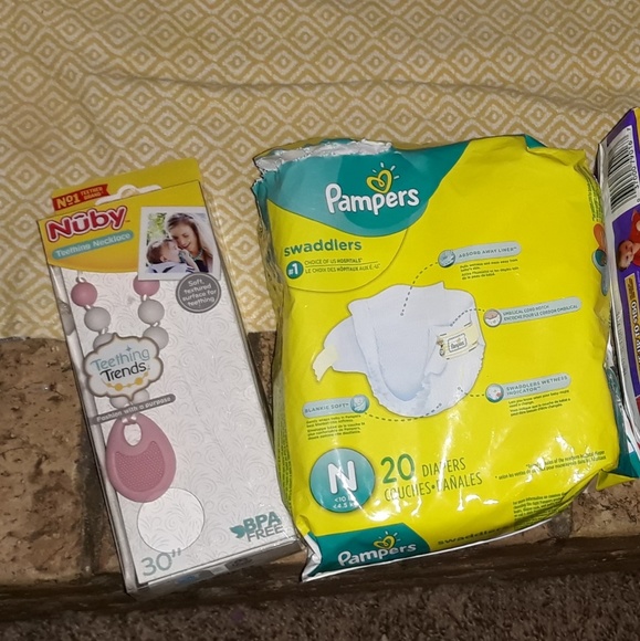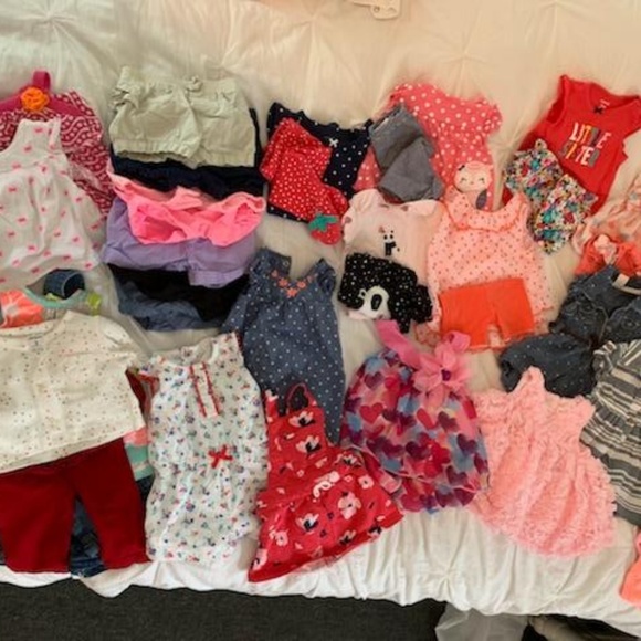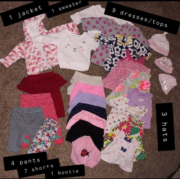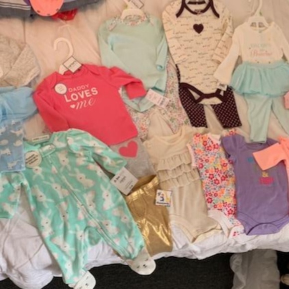 I have a bundle of baby girl clothes 0-3 months. If they aren´t brand new, they have only been worn once or twice...all in excellent condition/no stains. Mostly Carters brand. There are 115 items or more total, including approx.: 40 onesies, 12 bottoms, 2 sweaters/jacket, 13 brand new pieces, 26 outfits (some being 2 pieces), 3 hats, and 7 sleepers.There is also a brand new pack of newborn luvs diapers 32 ct, an open pack of size 1 Pampers with 14 of 20 remaining, and a teething toy.