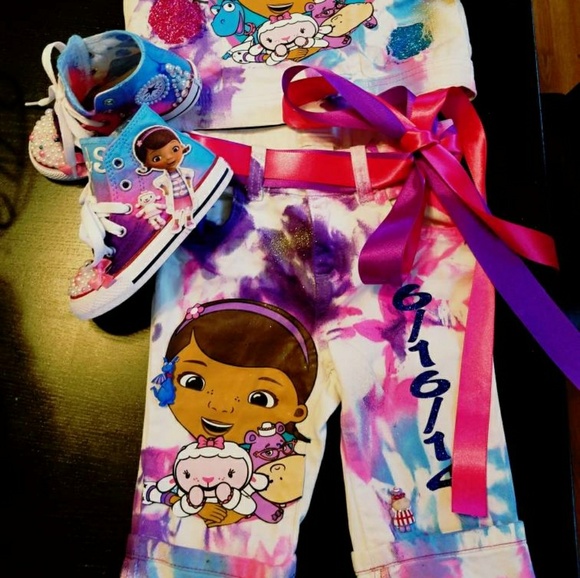 Your child will be the life of the party with a custom doc McStuffinsoutfit! This listing is for vest with name and bottoms ONLY. All outfits are made to order. Pleaae check out...