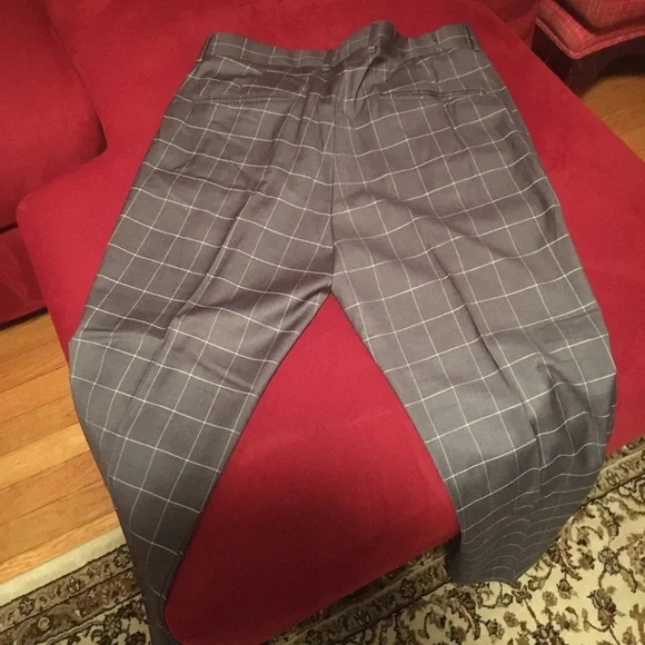 New Look Smoked grey British grid patterned modern pants with tapered bottoms. Skinny. Flat front. They are a 36 waist. I’m 6’4” and they come to my ankles to show off the modern look of socks, bare ankles, shoes etc. New and never worn.