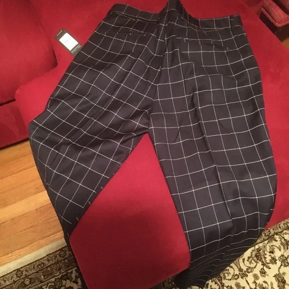 New Look of High Street black British grid patterned modern pants with tapered bottoms. Skinny. Flat front. I’m 6’4” and they come down to my ankles to show the mod look of socks, bare ankles, shoes, etc. New. Never worn.