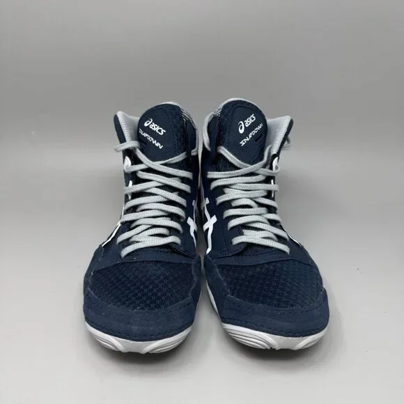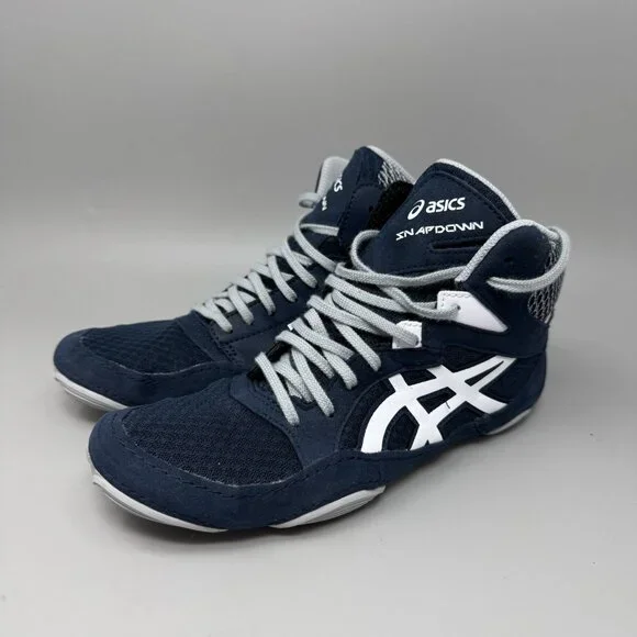 The ASICS Snapdown 3 Wrestling Shoes in Men´s Size 7 are a stylish and functional choice for athletic activities. With a durable suede and textile upper and a comfortable foam insole, these lace-up shoes provide cushioning and support. The blue and gray color scheme and high-top sneaker style make them a versatile option for all seasons. Designed for wrestling, these shoes also feature a breathable fabric lining and standard shoe width for a comfortable fit. Built by ASICS, a trusted brand in athletic footwear, these shoes are a solid choice for sports enthusiasts.