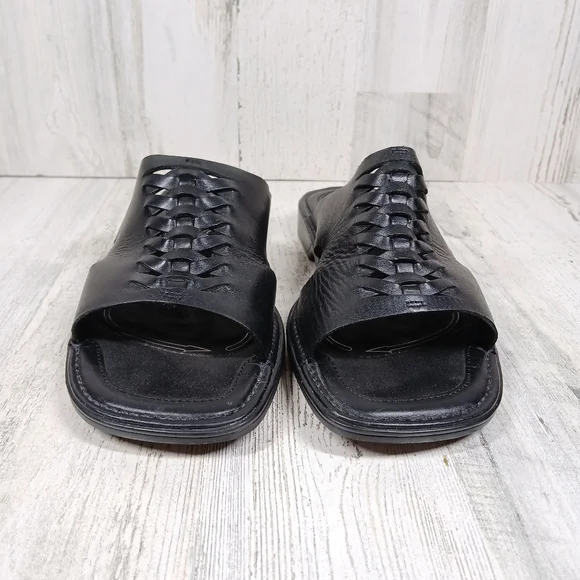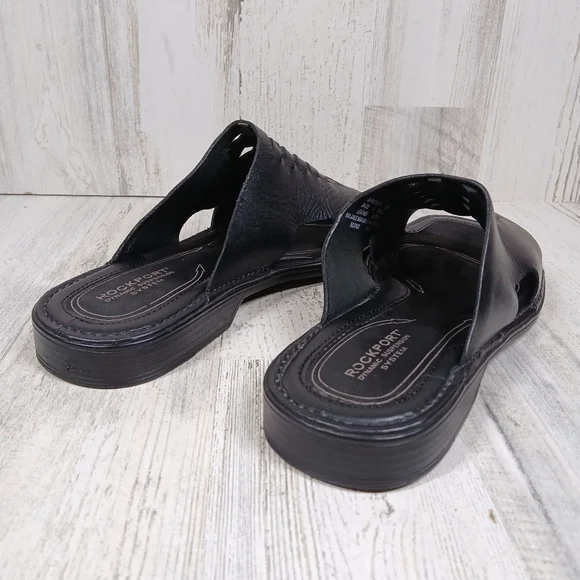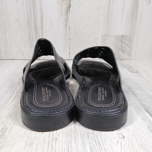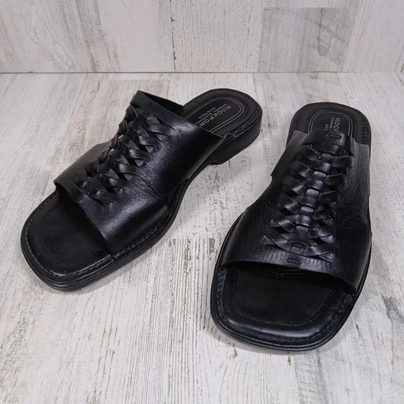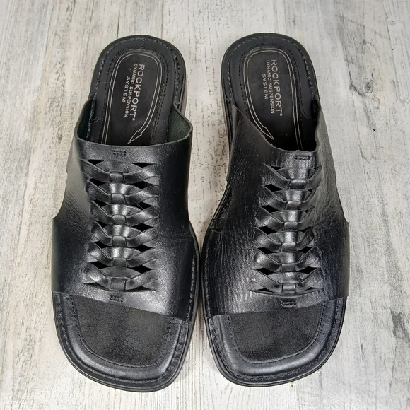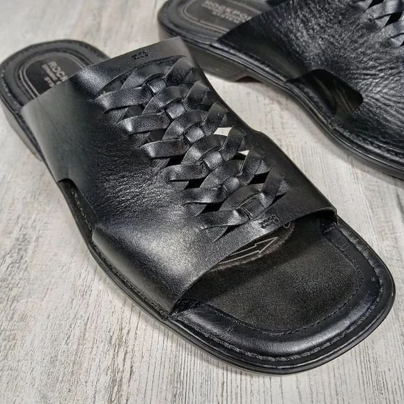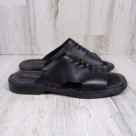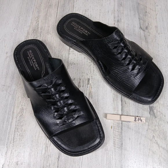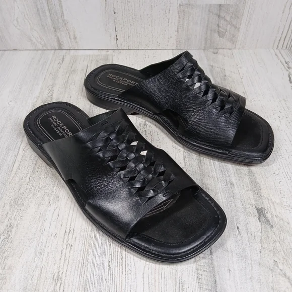 Rockport Black Leather Woven Slide Sandals Comfort Sole Slip-On Casual #814