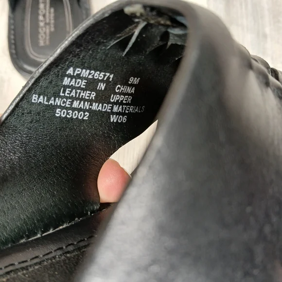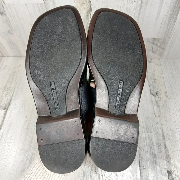 Pre-ownedStep into all-day comfort and timeless style with these Rockport Black Leather Woven Slide Sandals. Featuring a genuine leather upper with intricate woven detailing, these sandals offer a breathable open-toe design and easy slip-on styling. The contoured insole and man-made sole provide excellent cushioning and traction for everyday wear. Perfect for casual outings or lounging in warm weather, these slides blend durability and style in a classic silhouette.Leather upperOpen toeWoven design detailSlip-on style Man-made sole