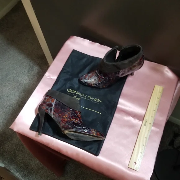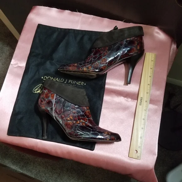 Donald J. Pliner Patent Leather Half Boot, size 7 1/2 N.The boot was called "Rula", its multi colored predominately brown and burgundy.The boot runs narrow.
