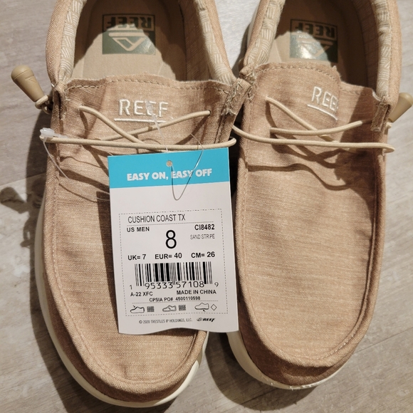 Reef Men´s Shoes CUSHION COAST TEXTILE Size 8 In Sand StipeNew with tags FEATURESPremium textile upper with a easy on and easy off stretch lace systemRidiculously comfortable Memory Foam Sock linerUltra lightweight and flexible EVA outsole
