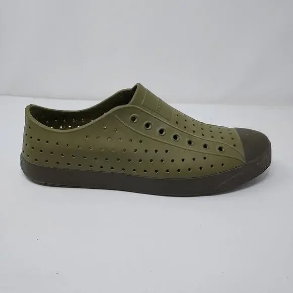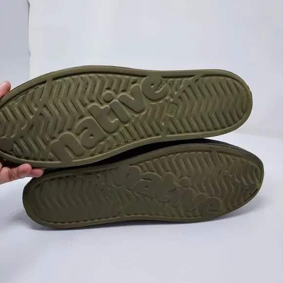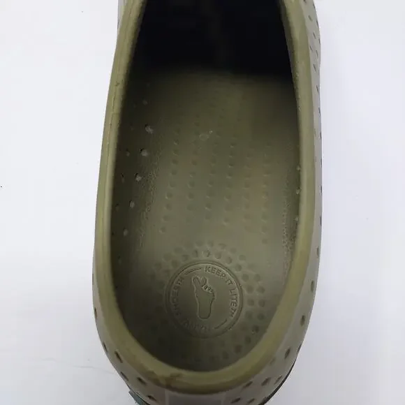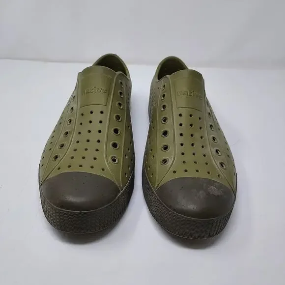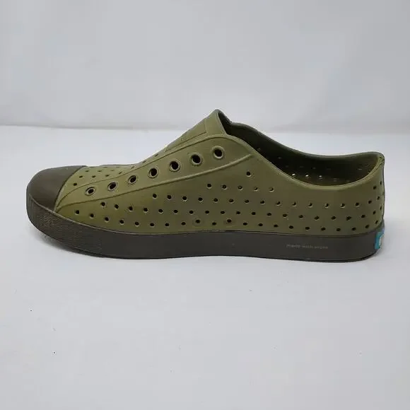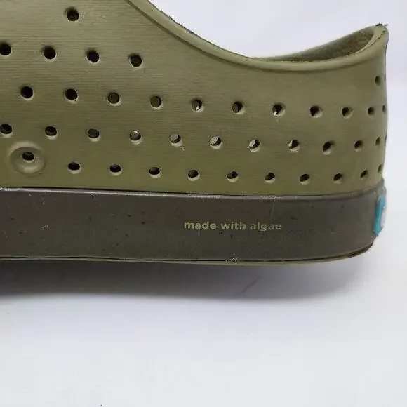 Made with algaeLightweight and comfortableArmy green colorSome wear at toeSize 11^805M725R