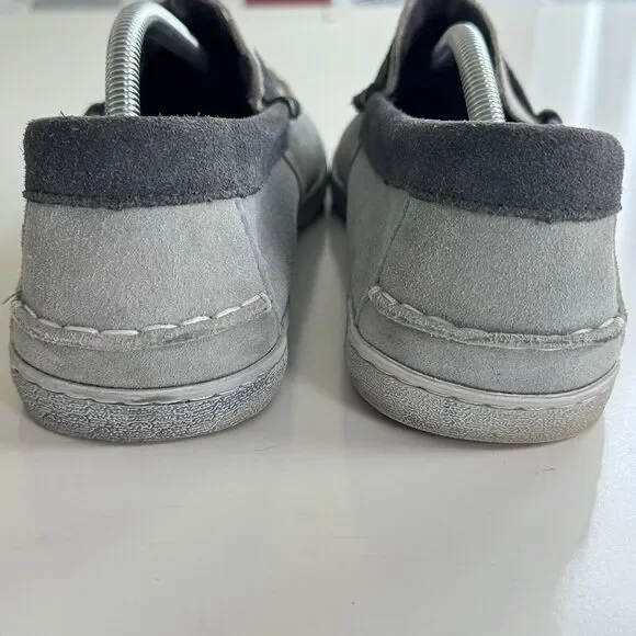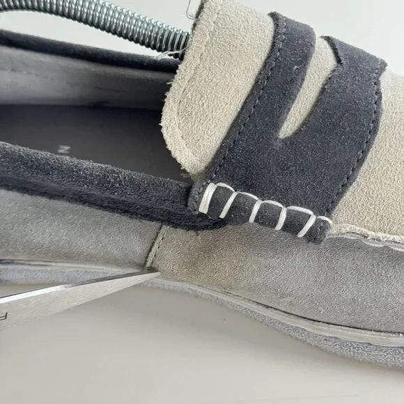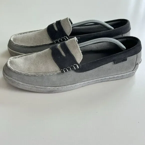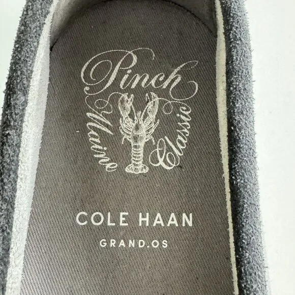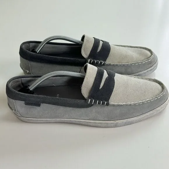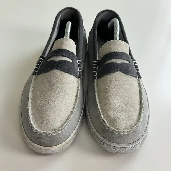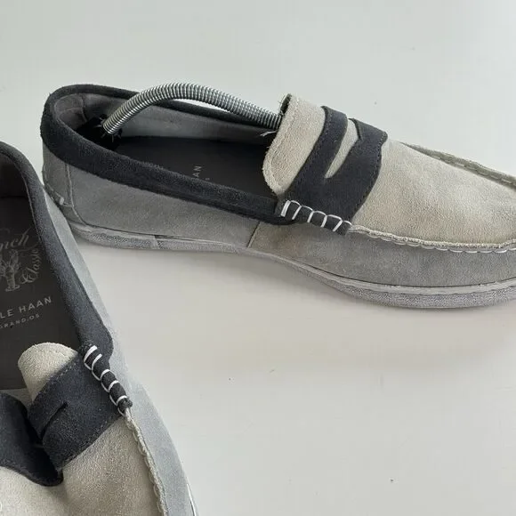 Cole Haan Grand OS Men´s Pinch Weekender Penny Loafer Shoes Gray Blue Suede 12M Maine Classics.Stained area at inner section of left shoe and some signs of wear on the inside. Otherwise, great pre-owned condition.