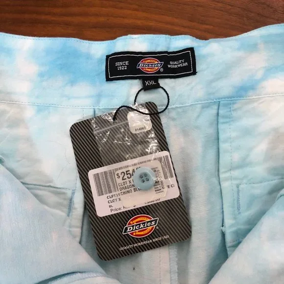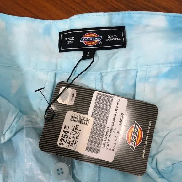 CLOT x DICKIES Lóng Wáng Tie-Dye Chino Pantnew with tags!!Size: Large Color: BlueRetail: $254 USD- Mid-rise Silhouette- Tie dye design- Zip fly with hook-bar top closure- Front slash pockets- Material: 100% Cotton CanvasMeasurements:LARGEWaist - 16 in / 40.6 cmInseam - 29 in / 73.7 cmLeg Opening - 8.5 in / 21.6 cmFront Rise - 11.5 in / 29.2 cmXXLWaist - 17.5 in / 44.5 cmInseam - 29.5 in / 74.9 cmLeg Opening - 8.5 in / 21.6 cmFront Rise - 11.5 in / 29.2 cm100% Authentic