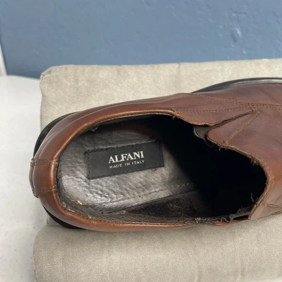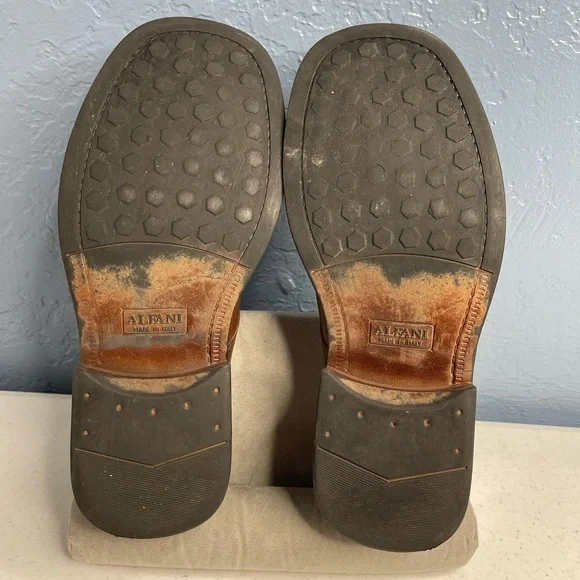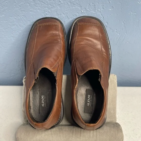 ALFANI Men Size 8M Musician Leather Brown Loafers Made In Italy. In great used condition. Very minor signs of wear. Square toe with a nice walking heal. Perfect for the office or church or any other occasion.