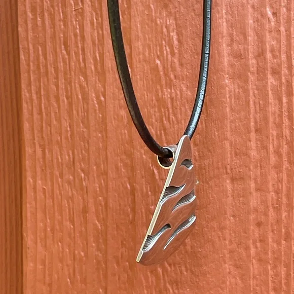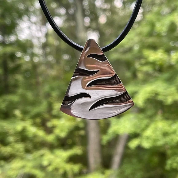 Heavy, large vintage wedge shaped sterling pendant with a tribal vibe. An older piece made in Mexico. Fully hallmarked. Including a black leather cord.CONDITION: excellent preloved condition SIZE: 1 3/4” long and just under 1 3/4” wide at the bottom WEIGHT: 20.12 grams per my digital scale