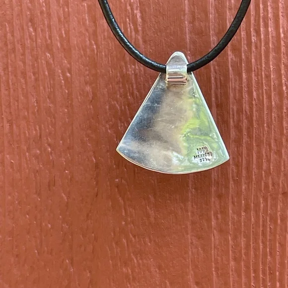 Heavy, large vintage wedge shaped sterling pendant with a tribal vibe. An older piece made in Mexico. Fully hallmarked. Including a black leather cord.CONDITION: excellent...