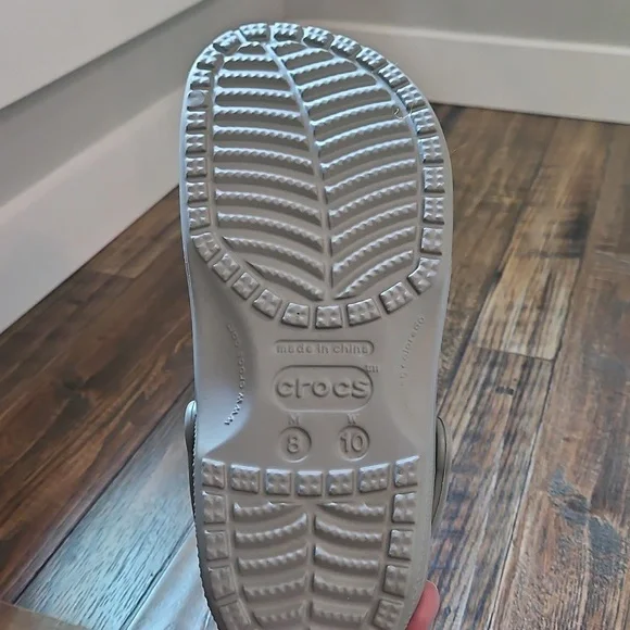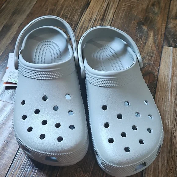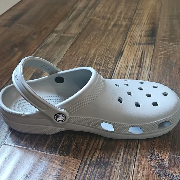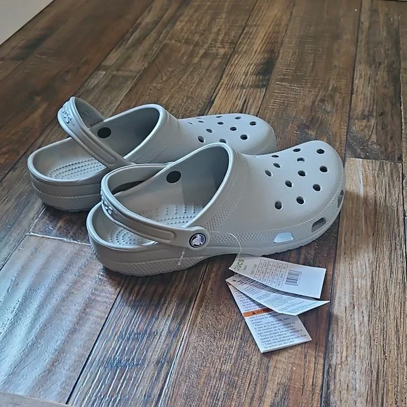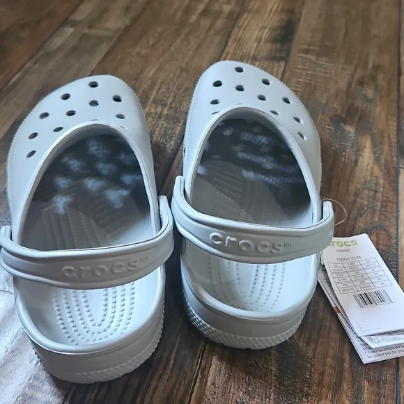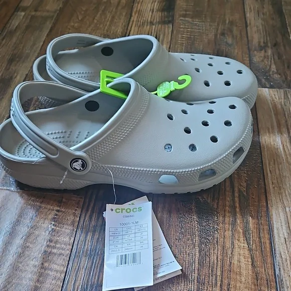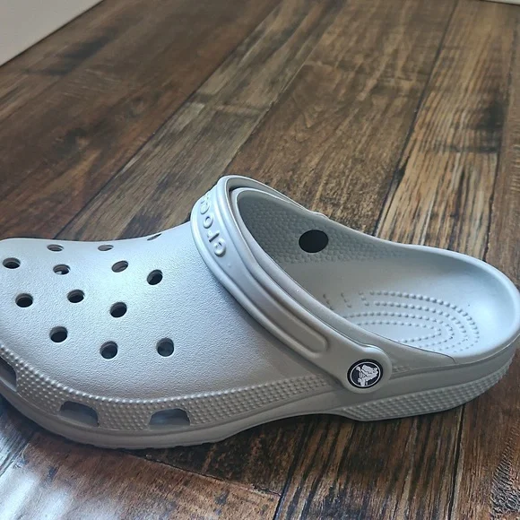 (New with tags) Experience the comfort and versatility of CROCS Gray Clog Shoes, designed with signature ventilation holes for breathability. These shoes feature a durable, molded one-piece construction and a pivoting heel strap for a secure fit. Perfect for All youractivities, their slip-on style and thick, textured sole ensure both convenience and stability.