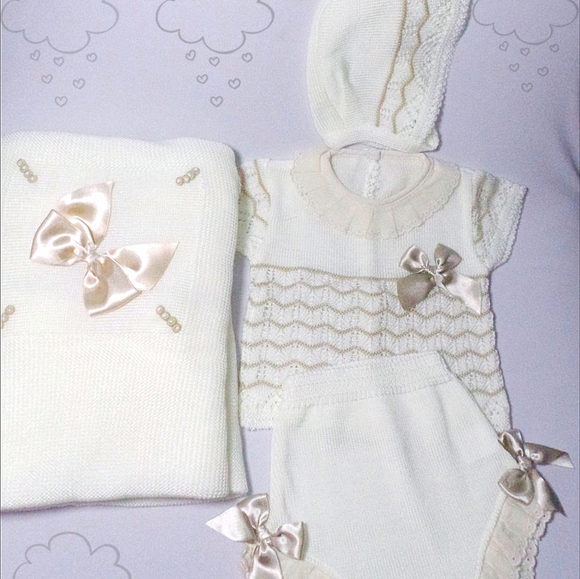 Super beautiful and delicate newborn set available, first wear or for an event, to match its very large blanket.special for summer.