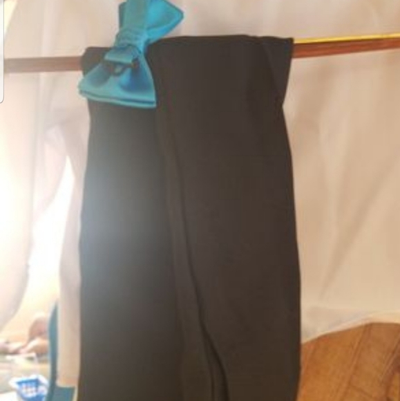 White shirt black pants blue or black bow tie